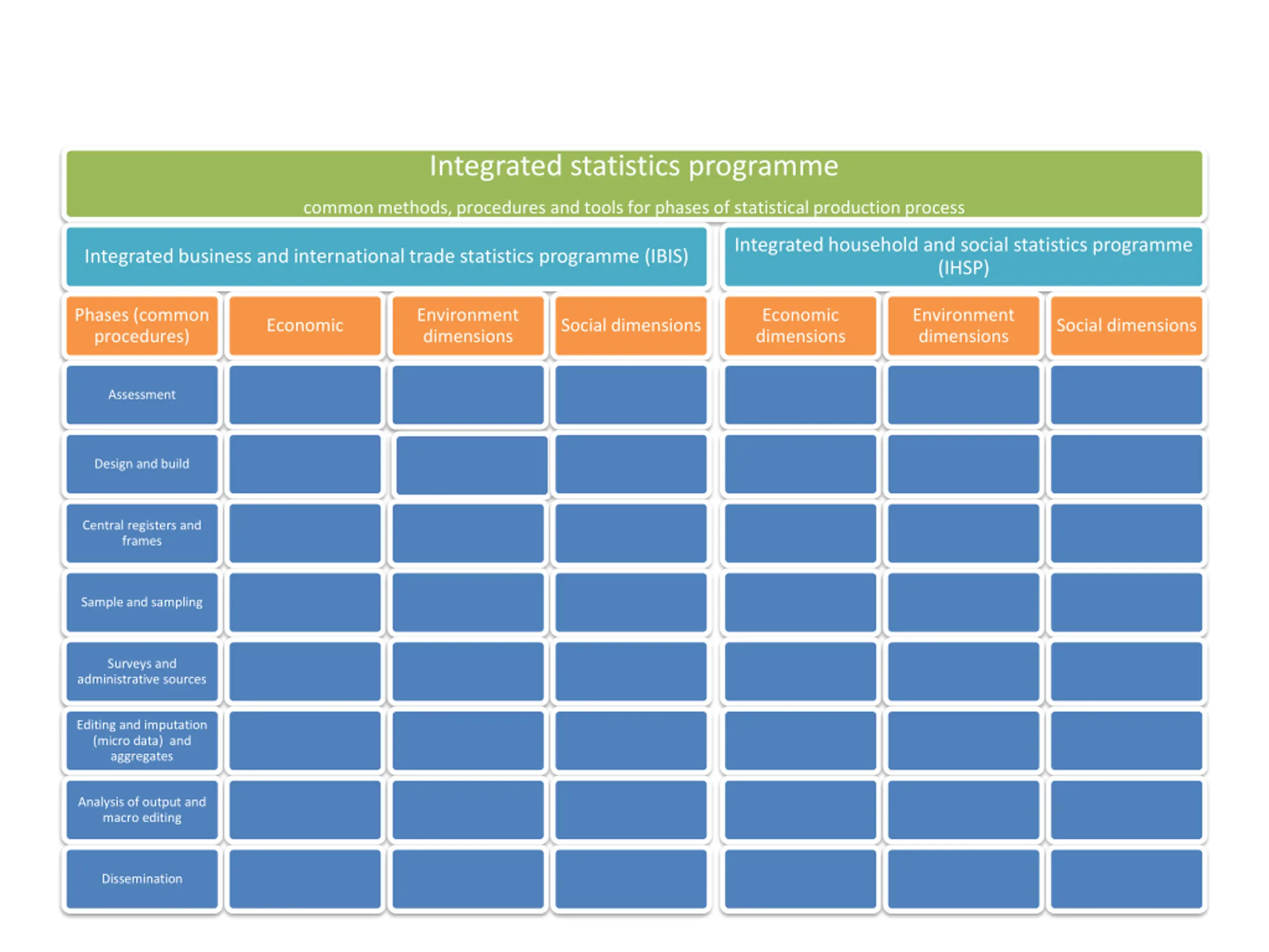 Coordination and management framework for capacity building initiatives Integrated statistics programme common methods, procedures and tools for phases of statistical production process Integrated household and social statistics programme (IHSP) Integrated business and international trade statistics programme (IBIS) Phases (common procedures) Environment dimensions Economic dimensions Environment dimensions Economic Social dimensions Social dimensions Assessment Design and build Central registers and frames Sample and sampling Surveys and administrative sources Editing and imputation (micro data) and aggregates Analysis of output and macro editing Dissemination