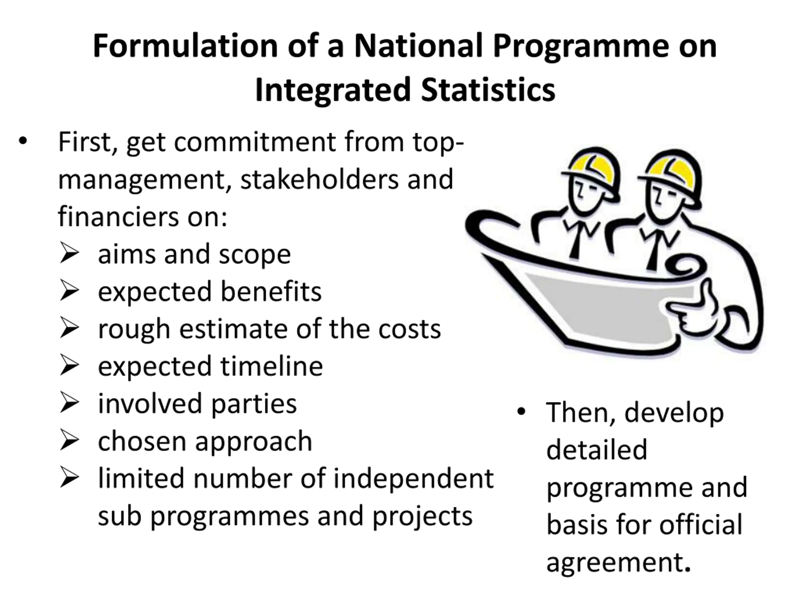 Formulation of a National Programme on Integrated Statistics First, get commitment from top- management, stakeholders and financiers on: aims and scope expected benefits rough estimate of the costs expected timeline involved parties chosen approach limited number of independent sub programmes and projects Then, develop detailed programme and basis for official agreement.