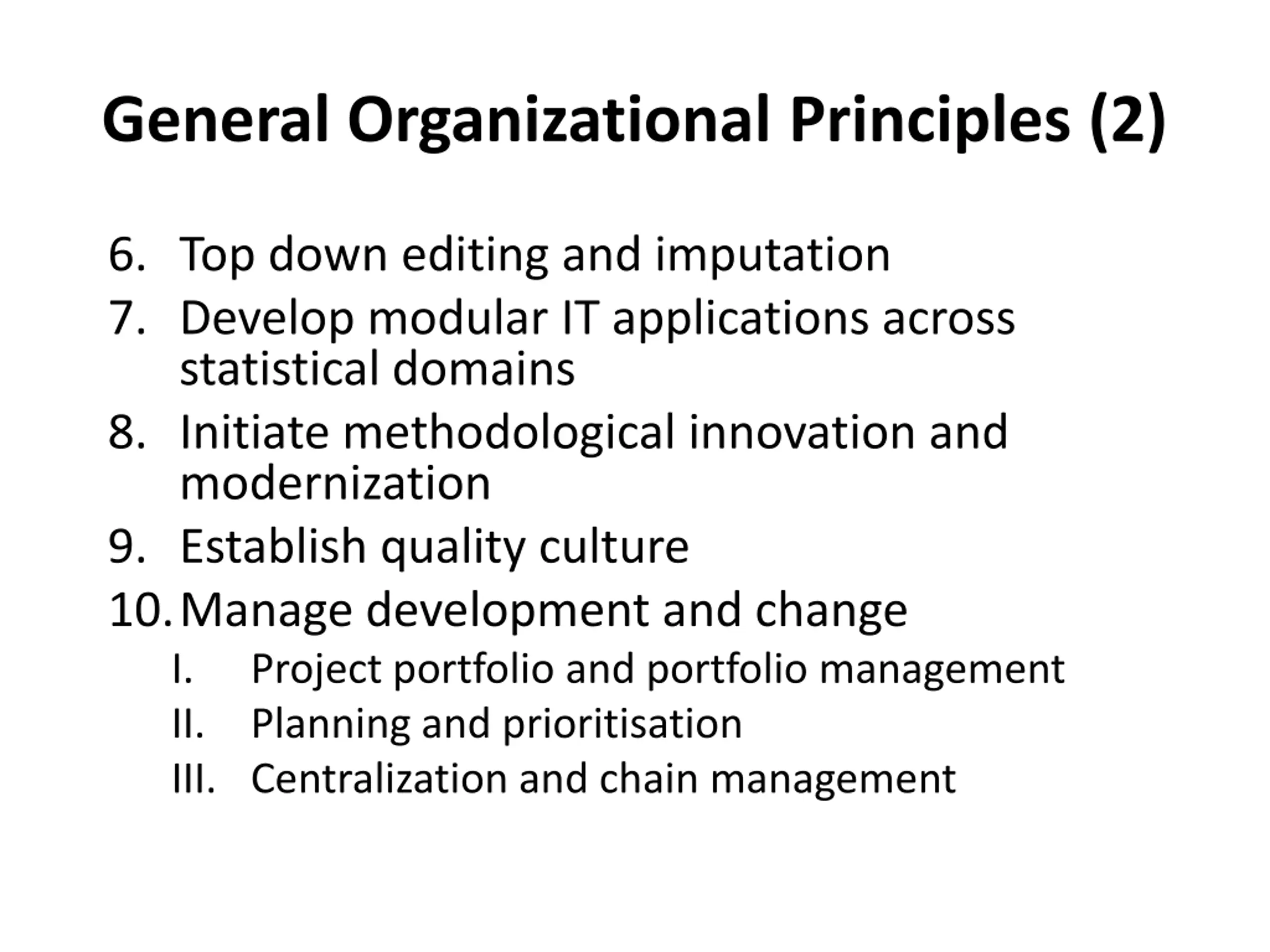 General Organizational Principles (2) 6. Top down editing and imputation 7. Develop modular IT applications across statistical domains 8. Initiate methodological innovation and modernization 9. Establish quality culture 10.Manage development and change I. Project portfolio and portfolio management II. Planning and prioritisation III. Centralization and chain management