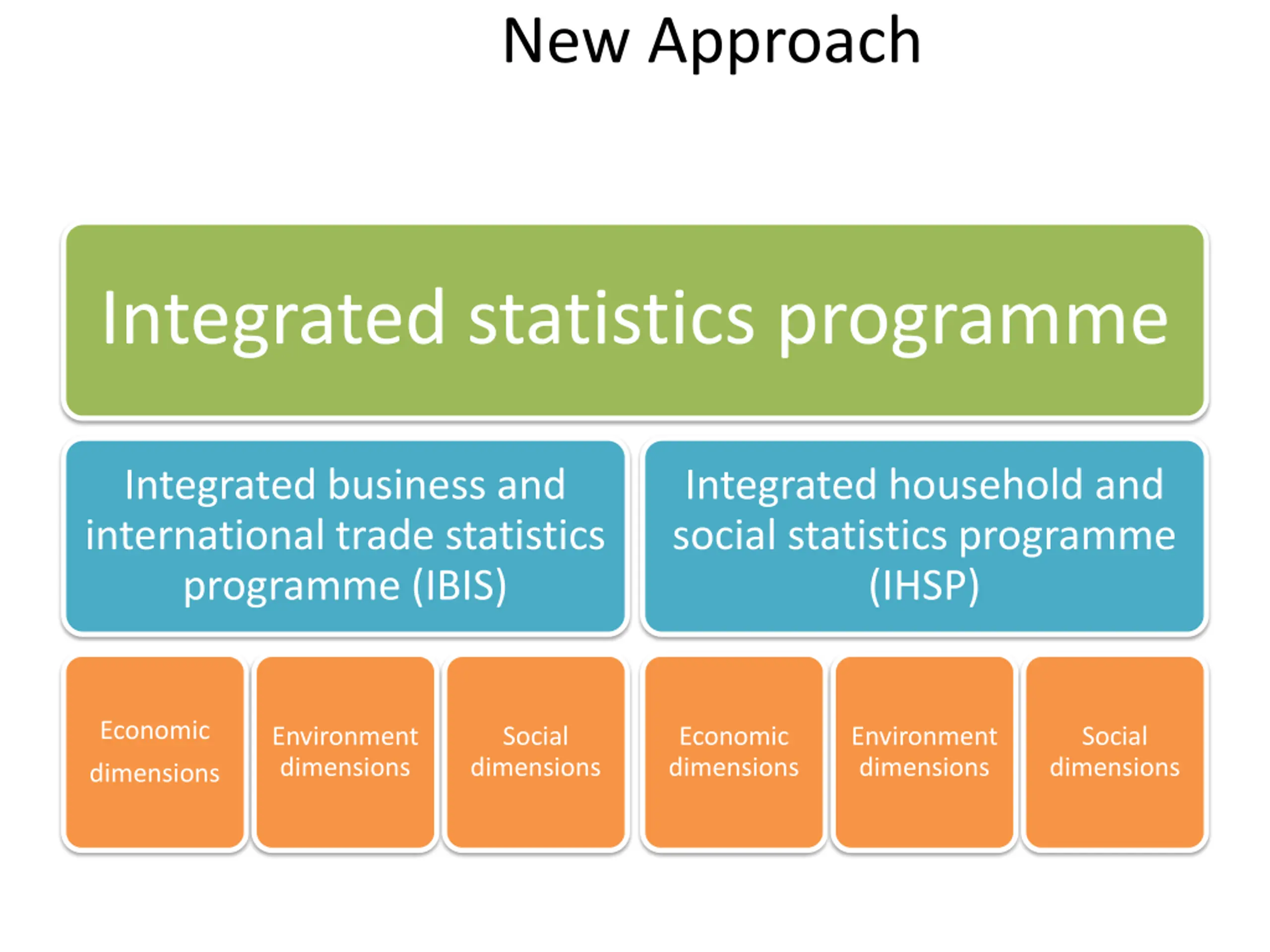 New Approach grated statistical production process and Integrated statistics programme Integrated business and international trade statistics programme (IBIS) Integrated household and social statistics programme (IHSP) Economic Environment dimensions Social dimensions Economic dimensions Environment dimensions Social dimensions dimensions