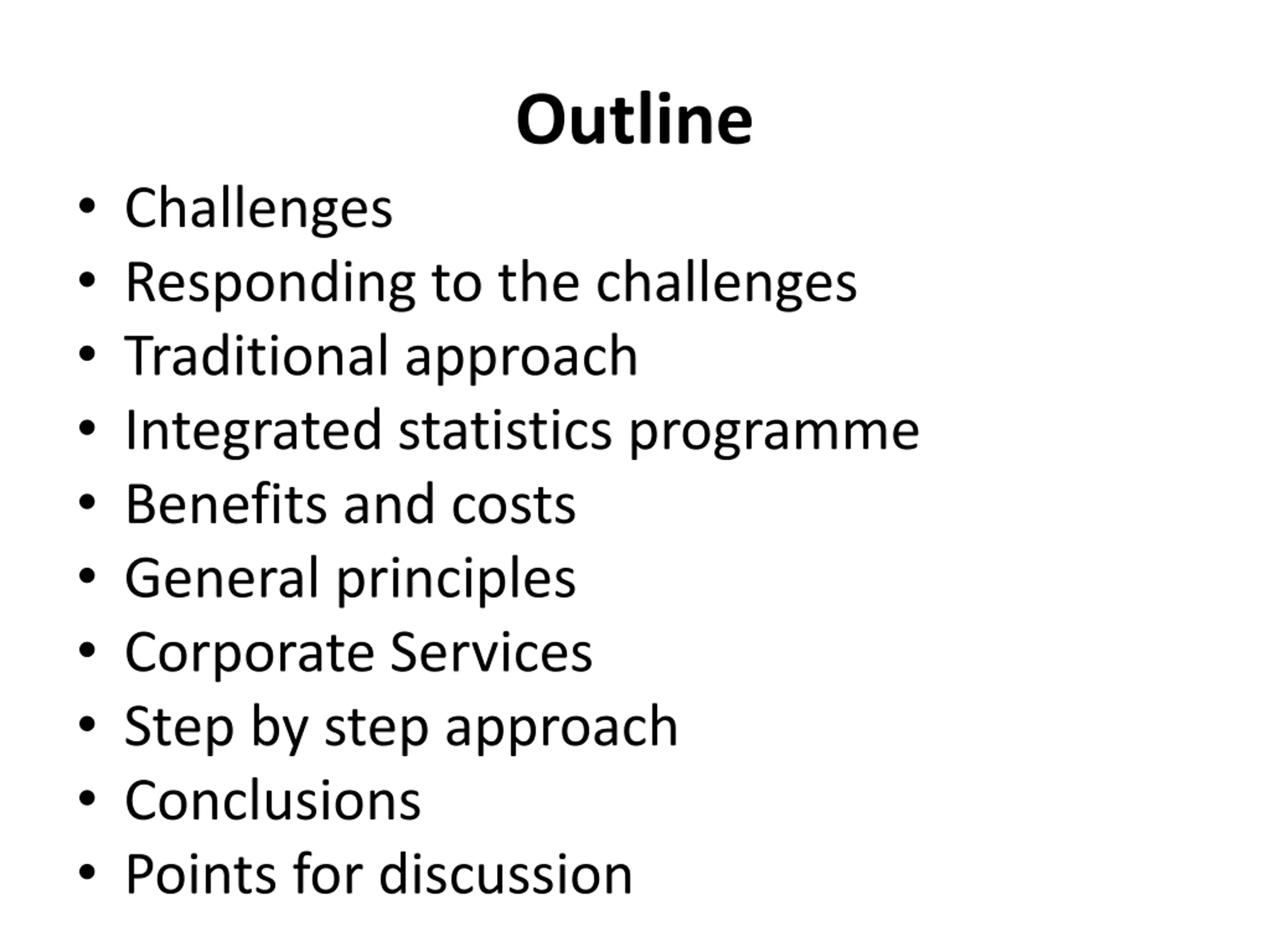 Outline Challenges Responding to the challenges Traditional approach Integrated statistics programme Benefits and costs General principles Corporate Services Step by step approach Conclusions Points for discussion