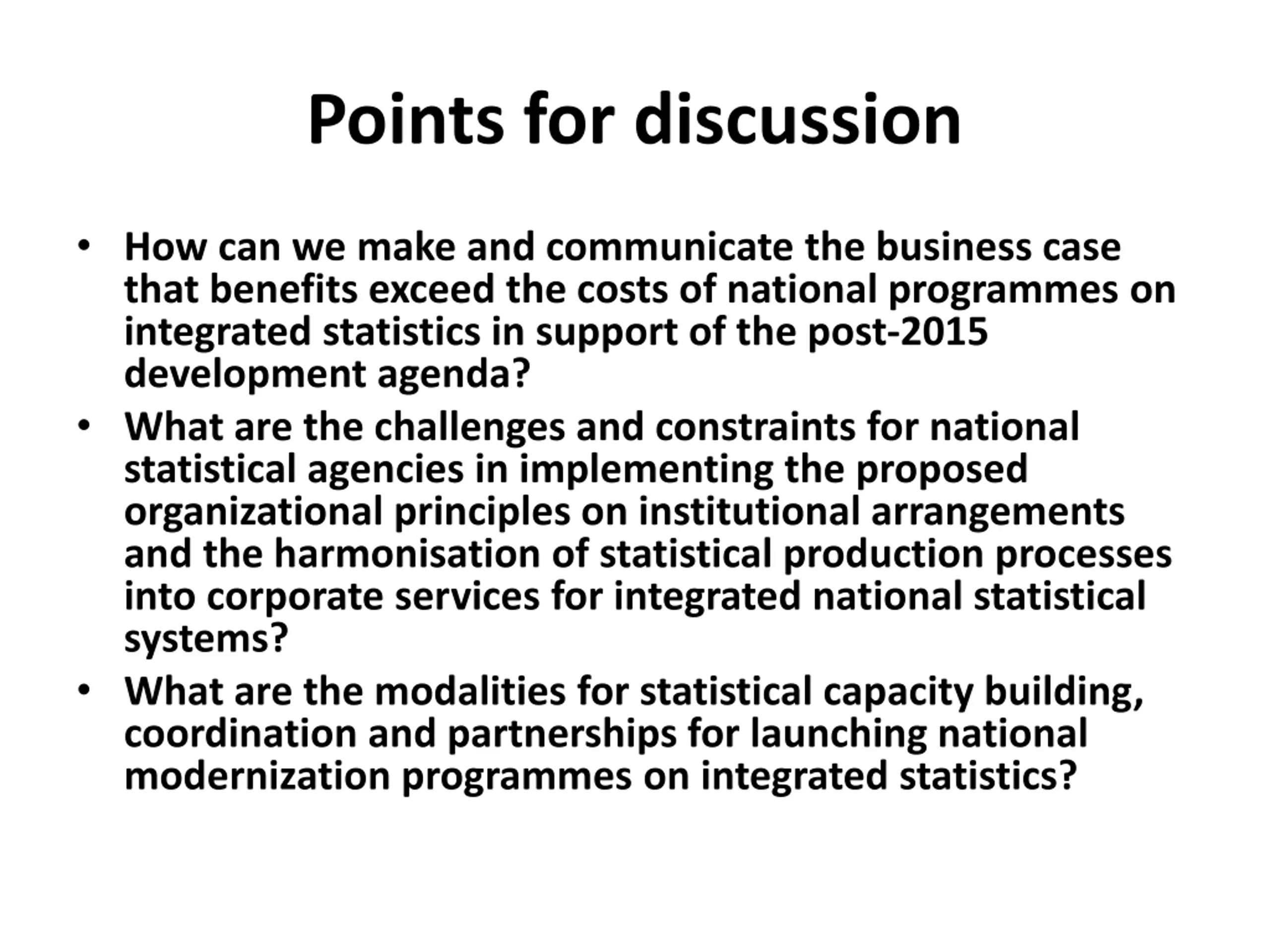 Points for discussion How can we make and communicate the business case that benefits exceed the costs of national programmes on integrated statistics in support of the post-2015 development agenda? What are the challenges and constraints for national statistical agencies in implementing the proposed organizational principles on institutional arrangements and the harmonisation of statistical production processes into corporate services for integrated national statistical systems? What are the modalities for statistical capacity building, coordination and partnerships for launching national modernization programmes on integrated statistics?