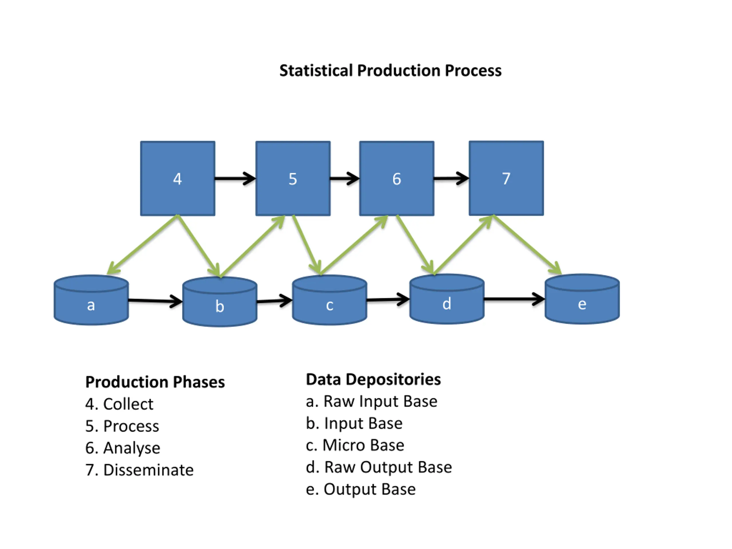 Statistical Production Process 7 4 5 6 d e a c b Data Depositories a. Raw Input Base b. Input Base c. Micro Base d. Raw Output Base e. Output Base Production Phases 4. Collect 5. Process 6. Analyse 7. Disseminate