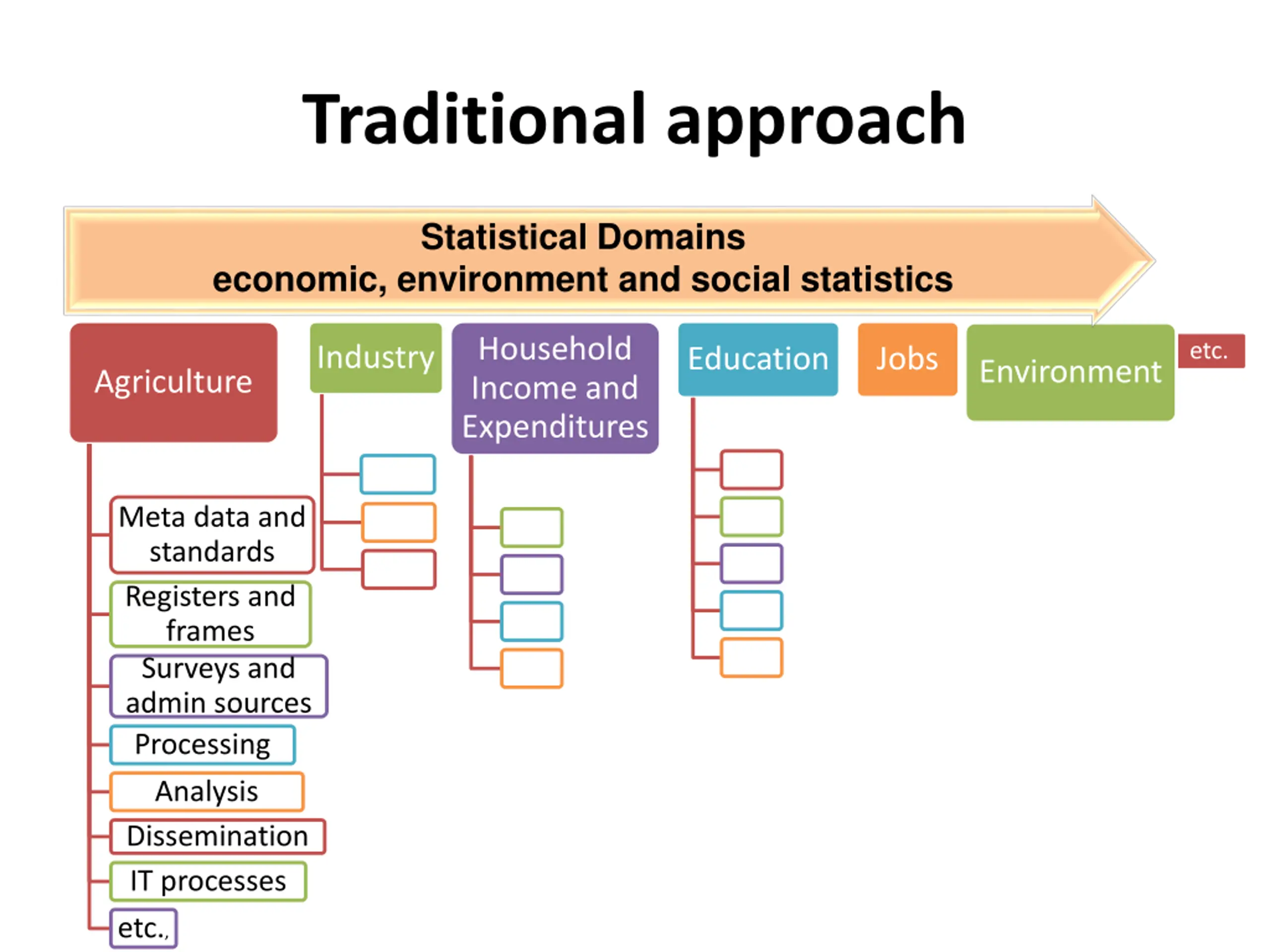 Traditional approach Statistical Domains economic, environment and social statistics Household Income and Expenditures etc. Industry Jobs Education Environment Agriculture Meta data and standards Registers and frames Surveys and admin sources Processing Analysis Dissemination IT processes etc.,