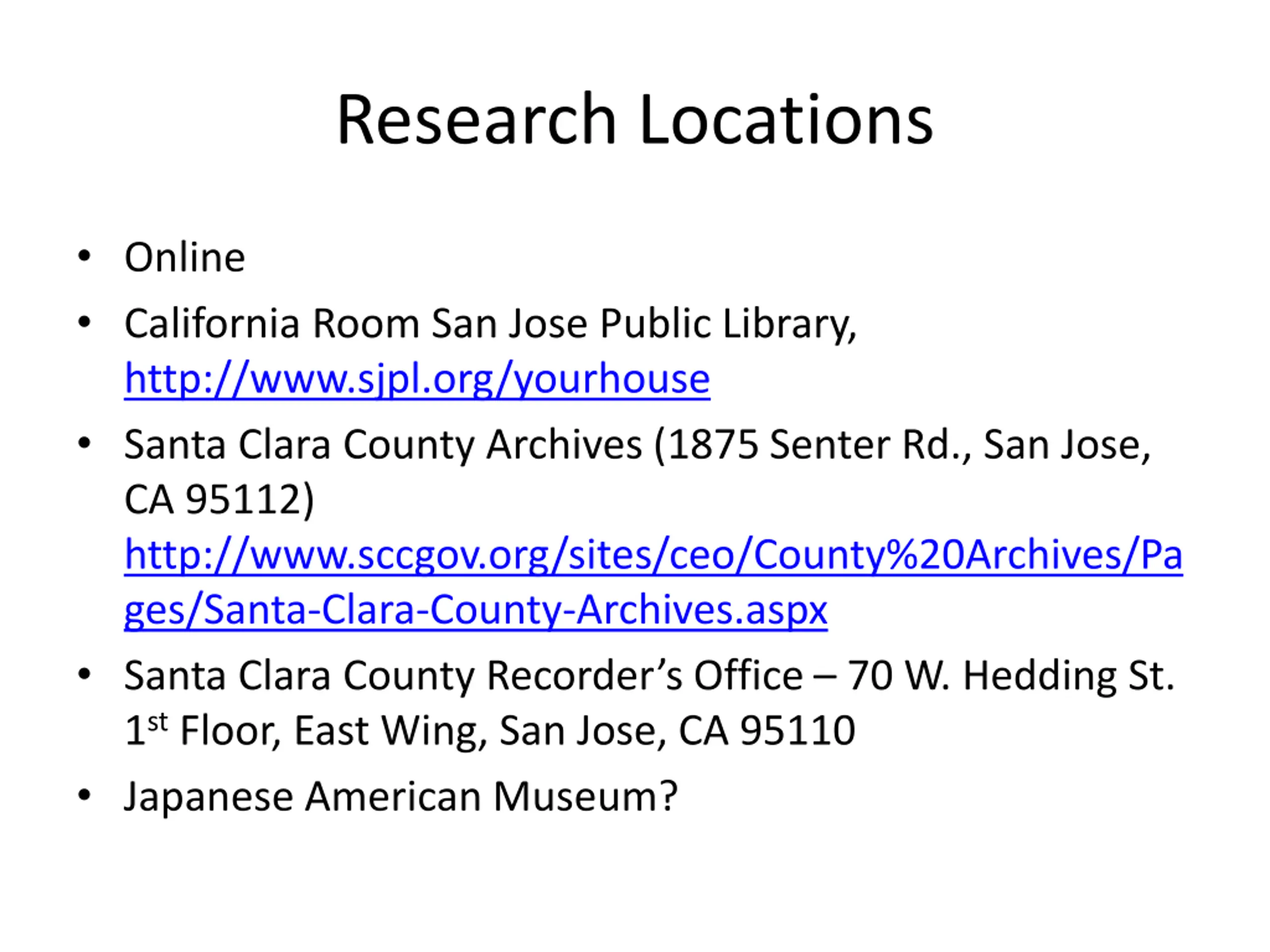 Research Locations Online California Room San Jose Public Library, http://www.sjpl.org/yourhouse Santa Clara County Archives (1875 Senter Rd., San Jose, CA 95112) http://www.sccgov.org/sites/ceo/County%20Archives/Pa ges/Santa-Clara-County-Archives.aspx Santa Clara County Recorder s Office 70 W. Hedding St. 1st Floor, East Wing, San Jose, CA 95110 Japanese American Museum?