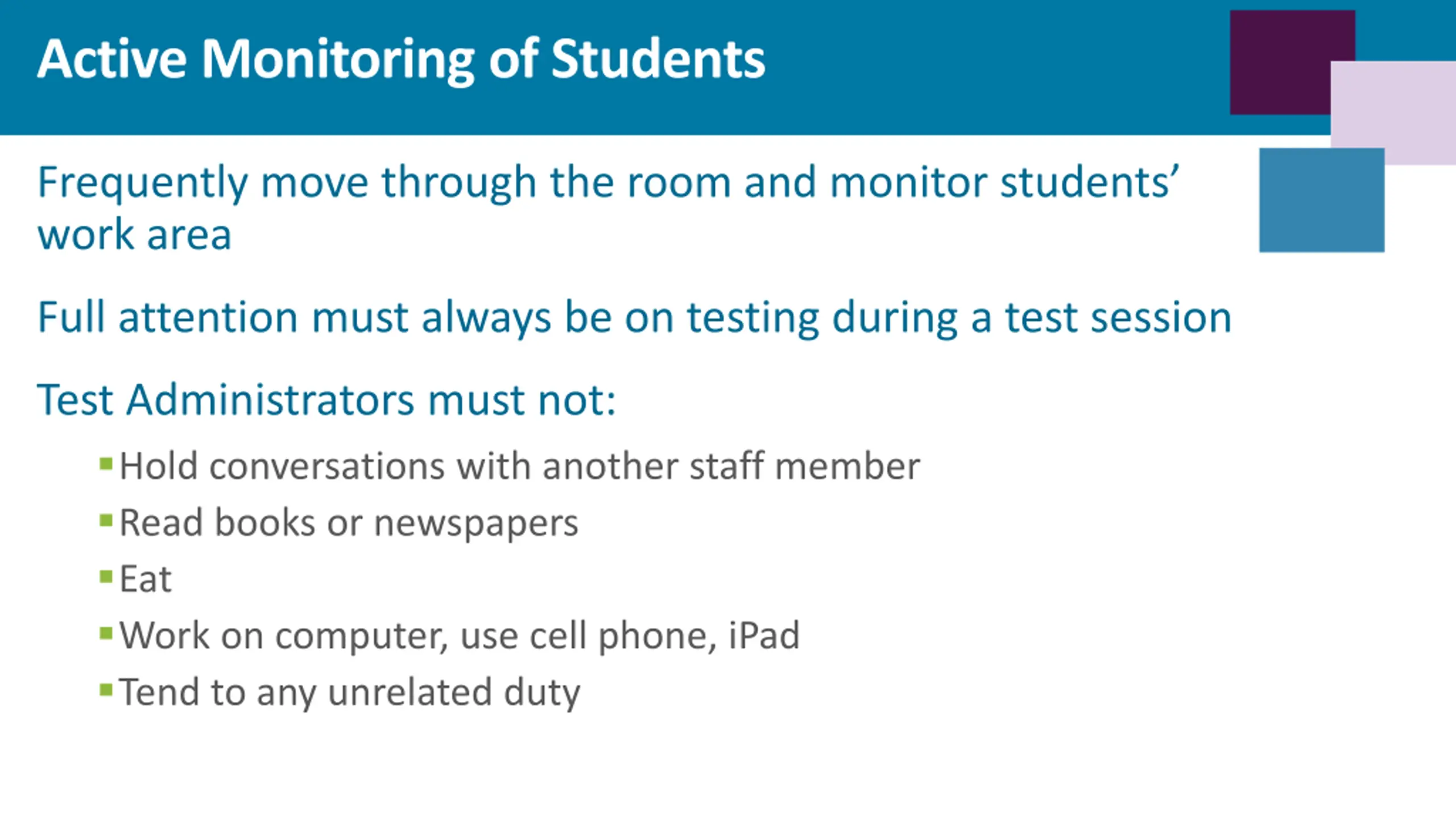 Active Monitoring of Students Frequently move through the room and monitor students work area Full attention must always be on testing during a test session Test Administrators must not: Hold conversations with another staff member Read books or newspapers Eat Work on computer, use cell phone, iPad Tend to any unrelated duty