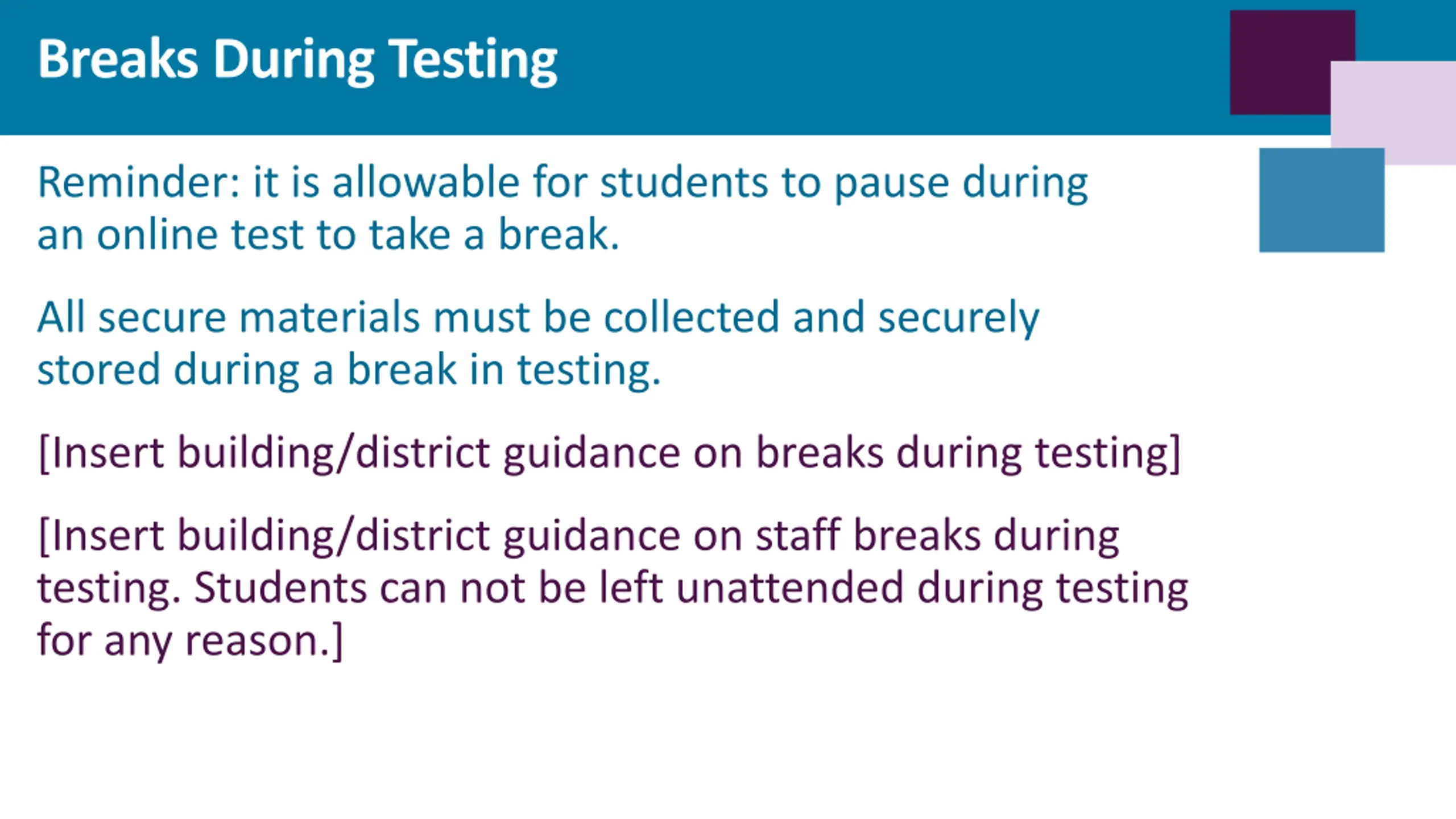 Breaks During Testing Reminder: it is allowable for students to pause during an online test to take a break. All secure materials must be collected and securely stored during a break in testing. [Insert building/district guidance on breaks during testing] [Insert building/district guidance on staff breaks during testing. Students can not be left unattended during testing for any reason.]