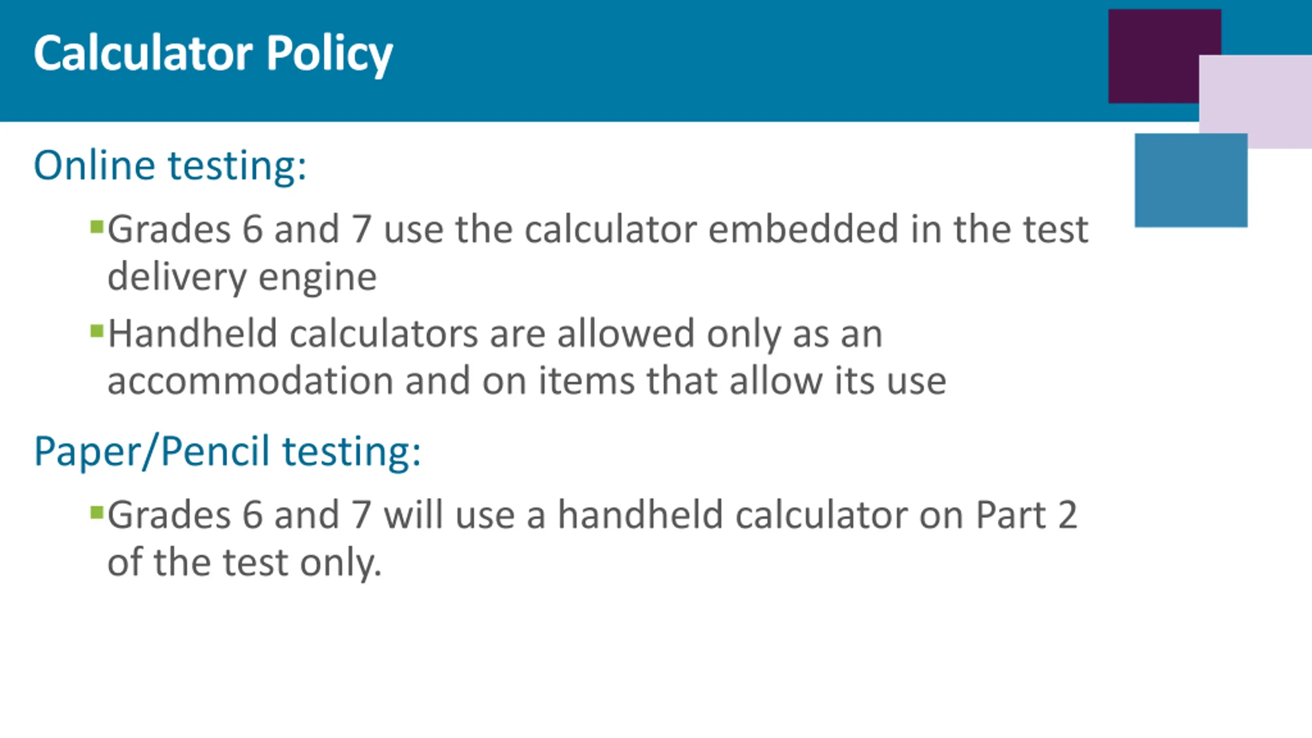 Calculator Policy 2 Online testing: Grades 6 and 7 use the calculator embedded in the test delivery engine Handheld calculators are allowed only as an accommodation and on items that allow its use Paper/Pencil testing: Grades 6 and 7 will use a handheld calculator on Part 2 of the test only.