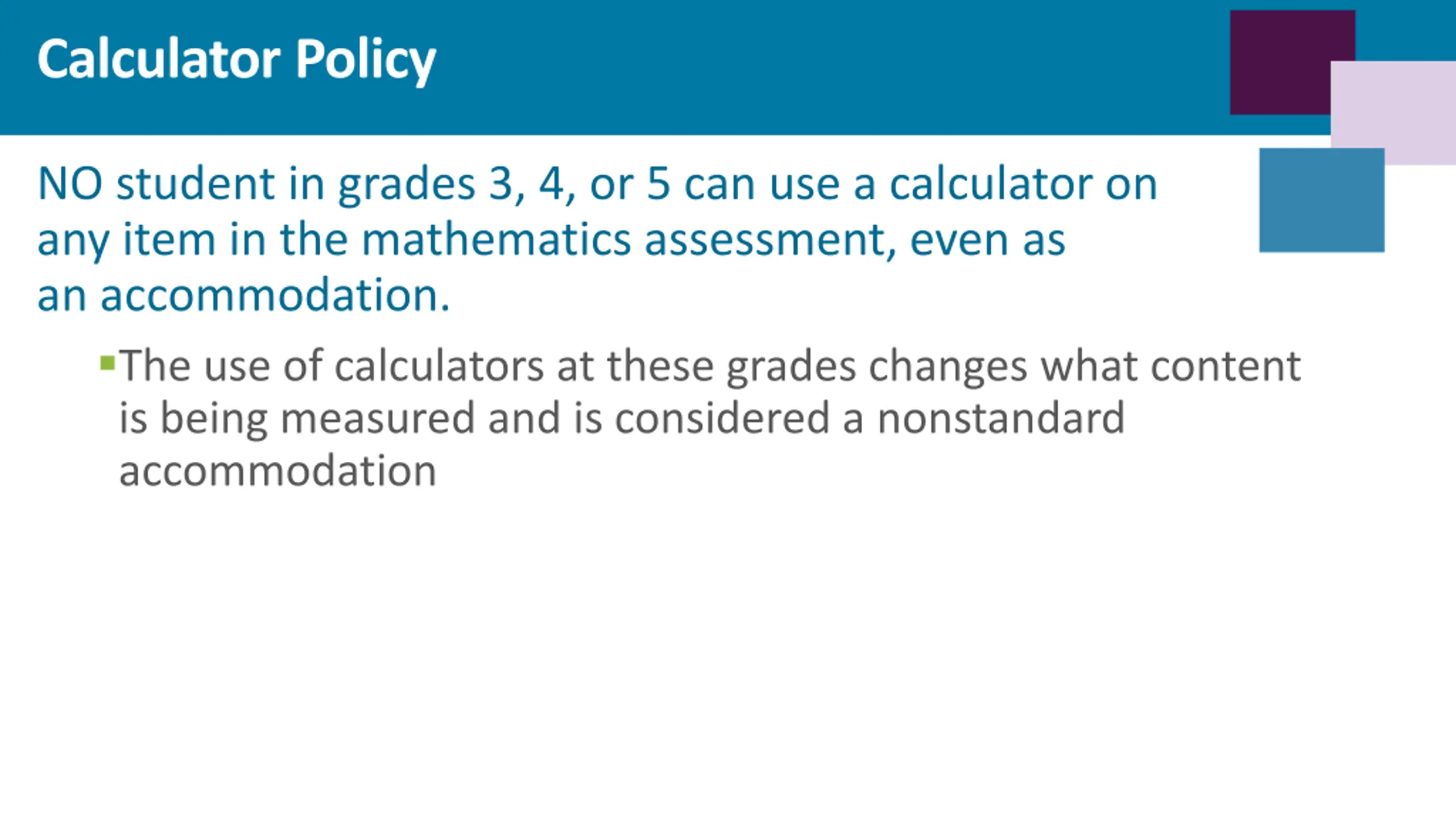 Calculator Policy NO student in grades 3, 4, or 5 can use a calculator on any item in the mathematics assessment, even as an accommodation. The use of calculators at these grades changes what content is being measured and is considered a nonstandard accommodation