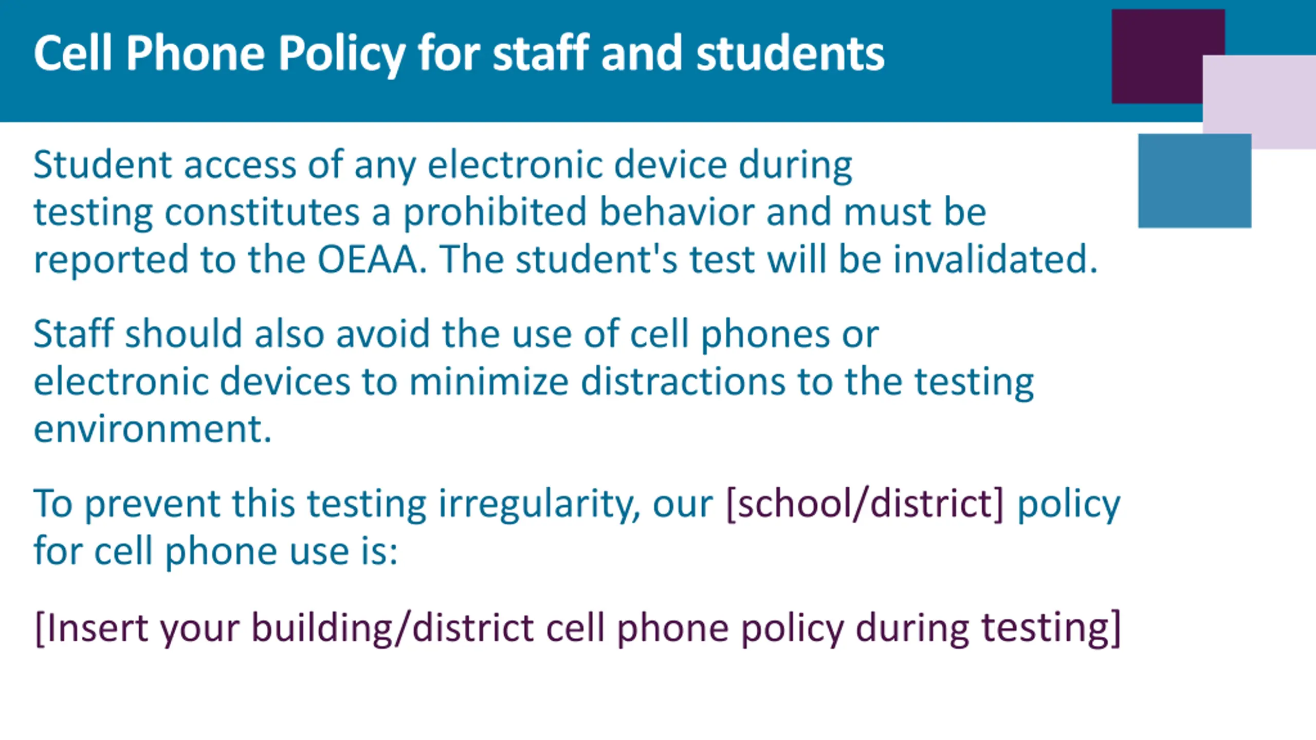Cell Phone Policy for staff and students Student access of any electronic device during testing constitutes a prohibited behavior and must be reported to the OEAA. The student's test will be invalidated. Staff should also avoid the use of cell phones or electronic devices to minimize distractions to the testing environment . To prevent this testing irregularity, our [school/district] policy for cell phone use is: [Insert your building/district cell phone policy during testing]