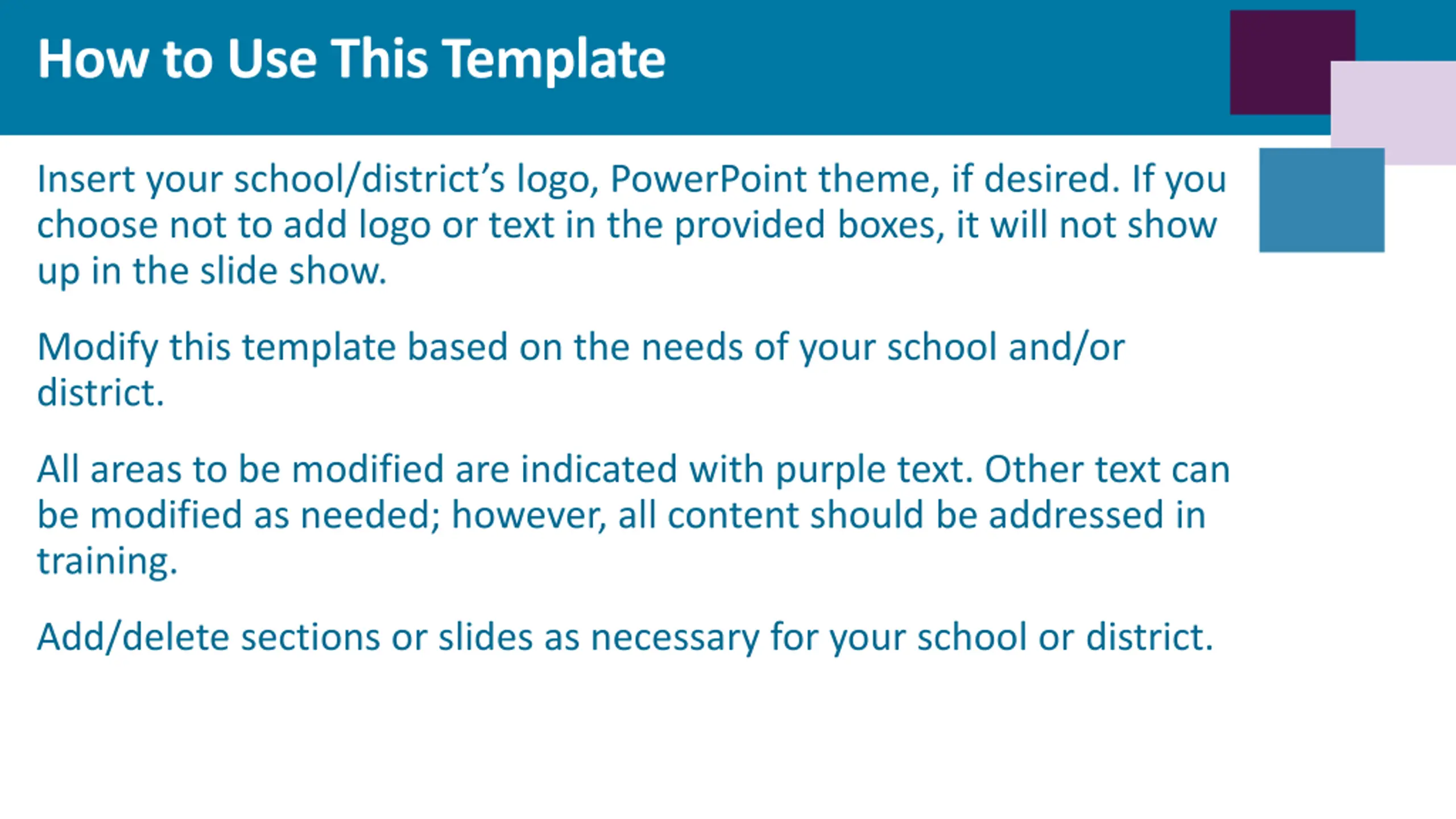 How to Use This Template Insert your school/district s logo, PowerPoint theme, if desired. If you choose not to add logo or text in the provided boxes, it will not show up in the slide show. Modify this template based on the needs of your school and/or district. All areas to be modified are indicated with purple text. Other text can be modified as needed; however, all content should be addressed in training. Add/delete sections or slides as necessary for your school or district.