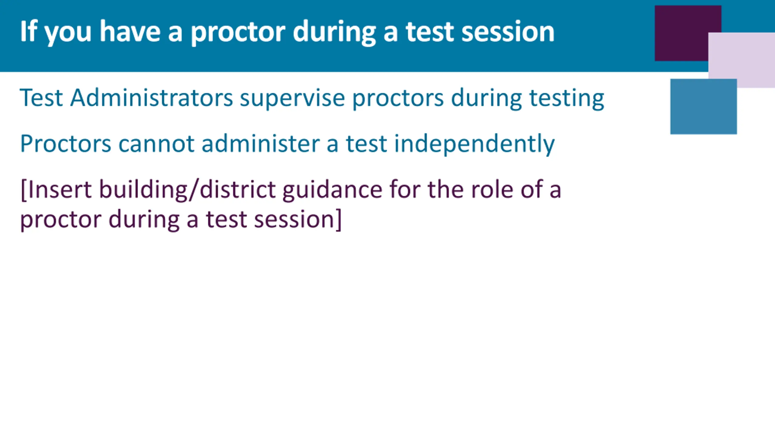 If you have a proctor during a test session Test Administrators supervise proctors during testing Proctors cannot administer a test independently [Insert building/district guidance for the role of a proctor during a test session]
