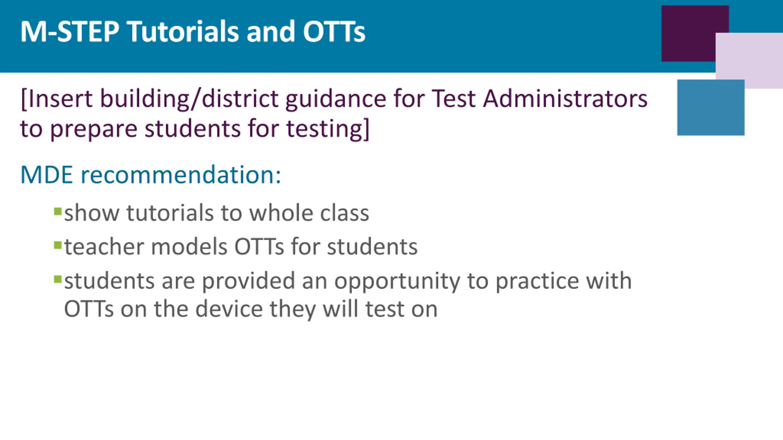 M-STEP Tutorials and OTTs [Insert building/district guidance for Test Administrators to prepare students for testing] MDE recommendation: show tutorials to whole class teacher models OTTs for students students are provided an opportunity to practice with OTTs on the device they will test on