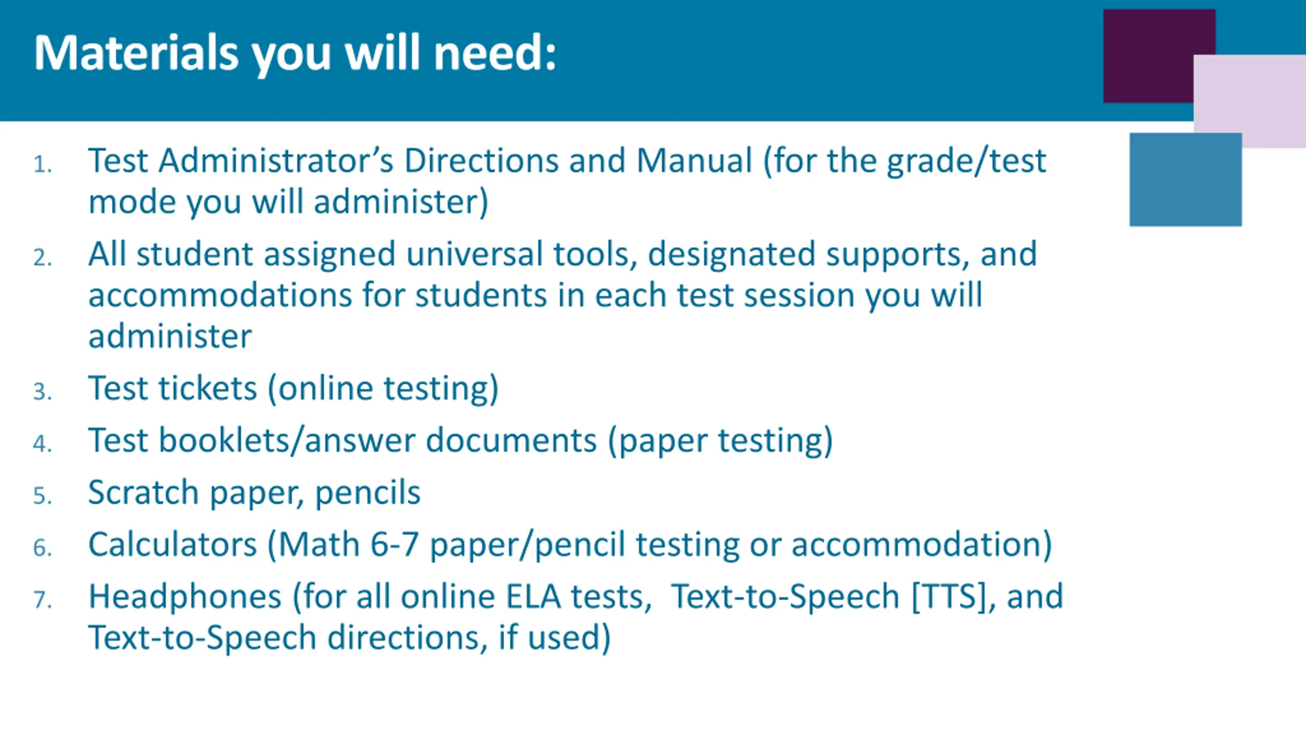Materials you will need: Test Administrator s Directions and Manual (for the grade/test mode you will administer) All student assigned universal tools, designated supports, and accommodations for students in each test session you will administer Test tickets (online testing) Test booklets/answer documents (paper testing) Scratch paper, pencils Calculators (Math 6-7 paper/pencil testing or accommodation) Headphones (for all online ELA tests, Text-to-Speech [TTS], and Text-to-Speech directions, if used) 1. 2. 3. 4. 5. 6. 7.