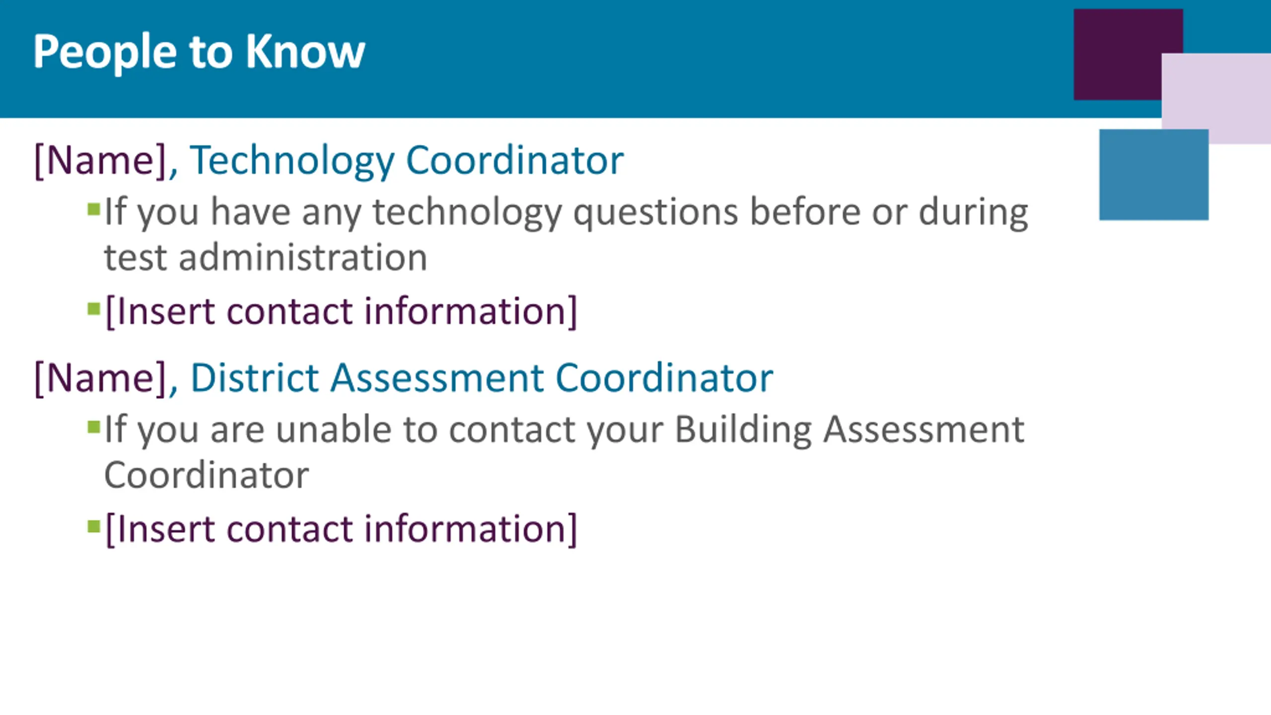 People to Know 2 [Name], Technology Coordinator If you have any technology questions before or during test administration [Insert contact information] [Name], District Assessment Coordinator If you are unable to contact your Building Assessment Coordinator [Insert contact information]