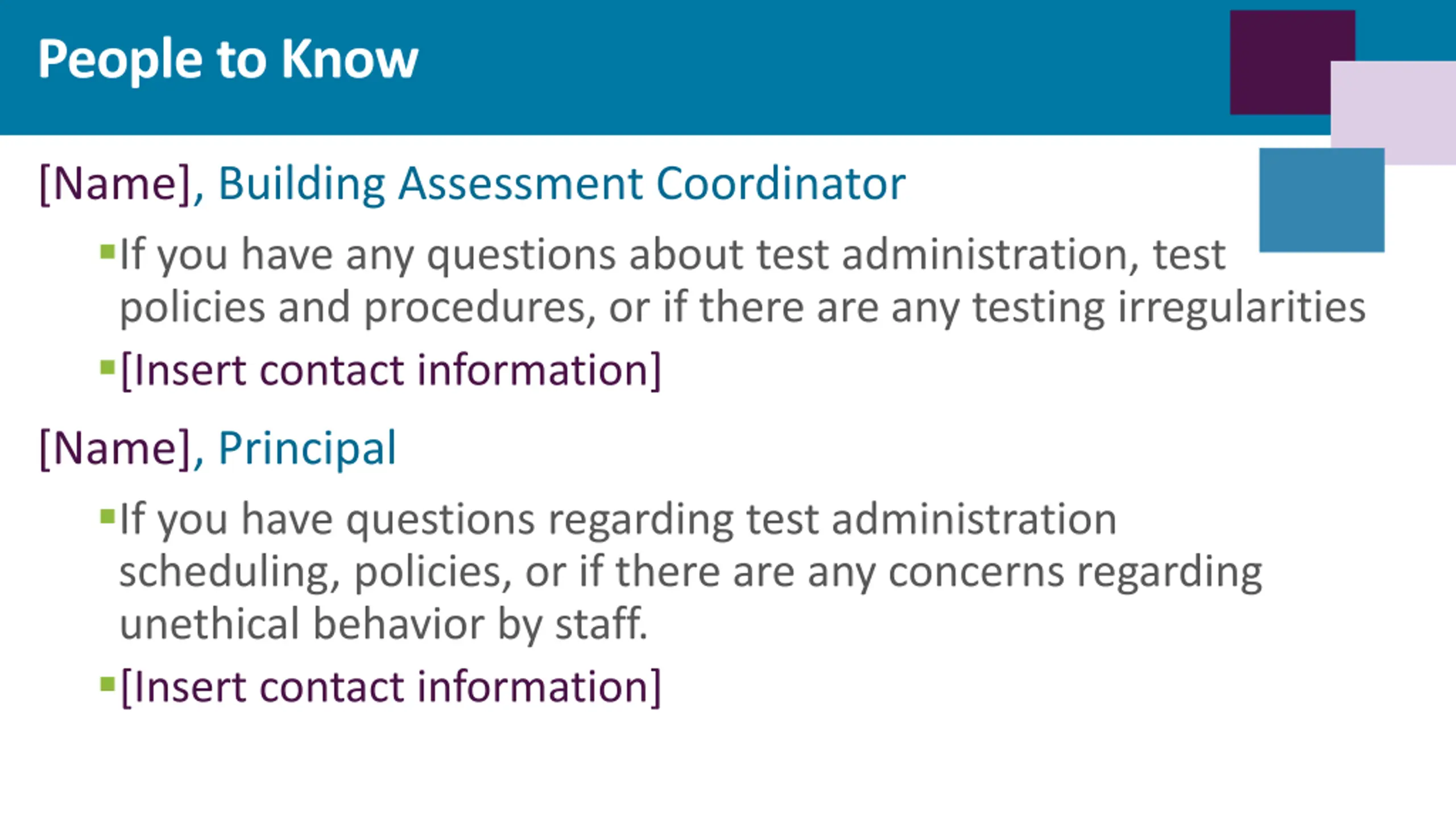 People to Know 3 [Name], Building Assessment Coordinator If you have any questions about test administration, test policies and procedures, or if there are any testing irregularities [Insert contact information] [Name], Principal If you have questions regarding test administration scheduling, policies, or if there are any concerns regarding unethical behavior by staff. [Insert contact information]