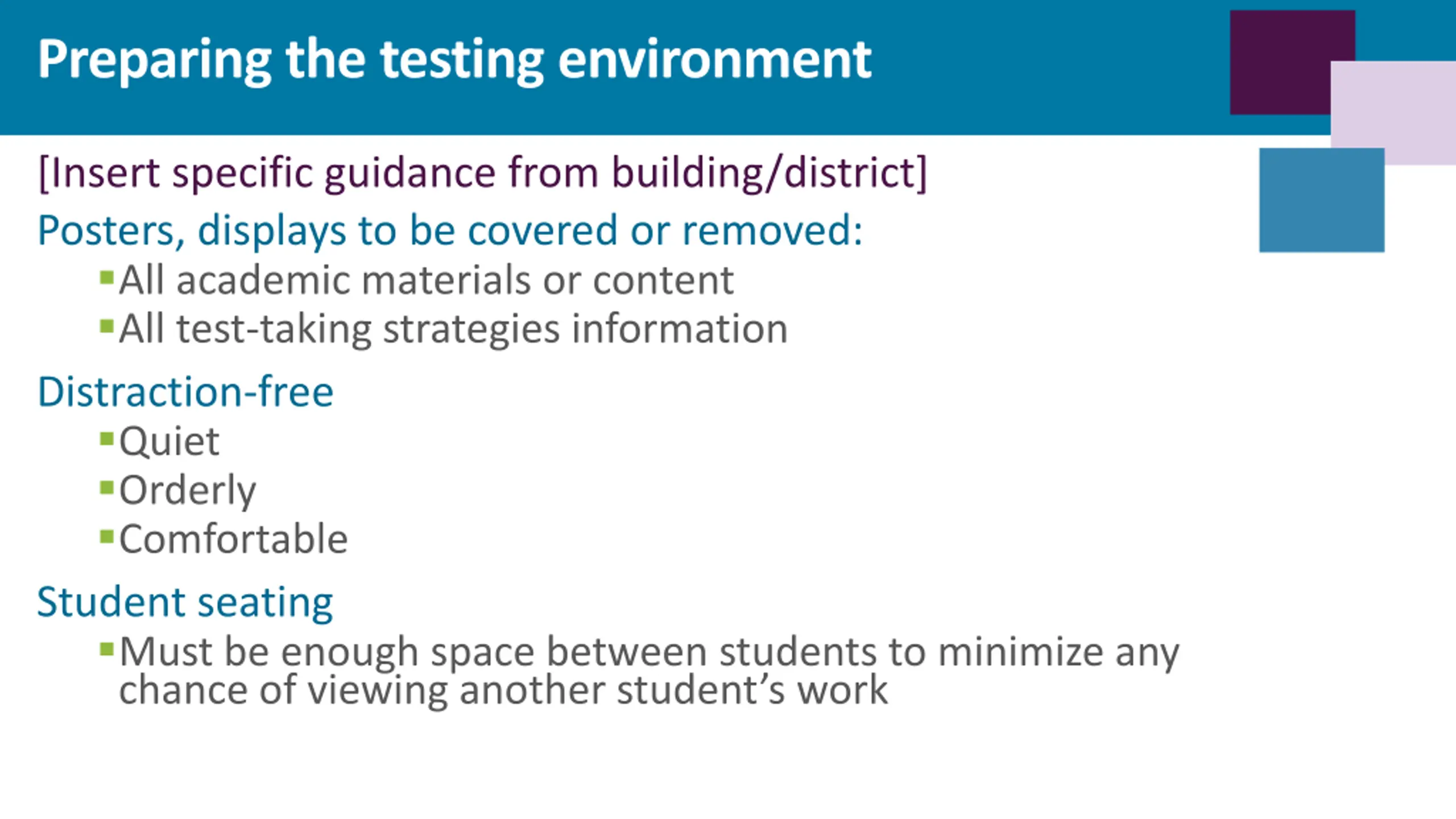 Preparing the testing environment [Insert specific guidance from building/district] Posters, displays to be covered or removed: All academic materials or content All test-taking strategies information Distraction-free Quiet Orderly Comfortable Student seating Must be enough space between students to minimize any chance of viewing another student s work