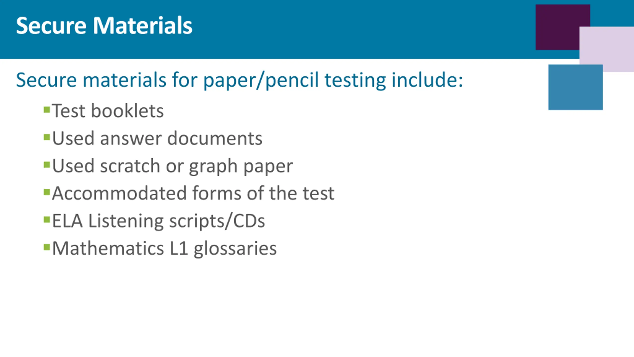 Secure Materials 2 Secure materials for paper/pencil testing include: Test booklets Used answer documents Used scratch or graph paper Accommodated forms of the test ELA Listening scripts/CDs Mathematics L1 glossaries