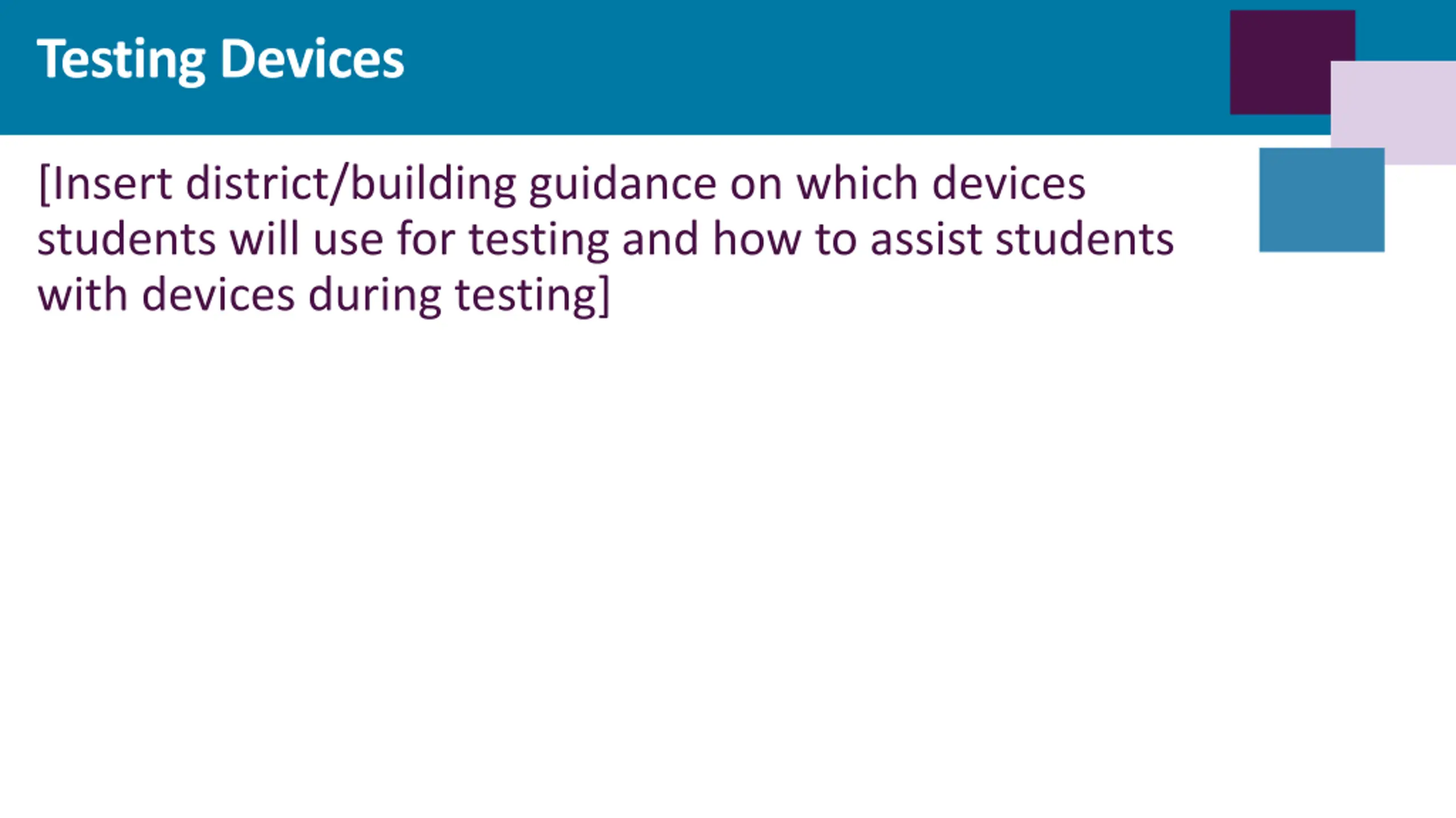 Testing Devices [Insert district/building guidance on which devices students will use for testing and how to assist students with devices during testing]