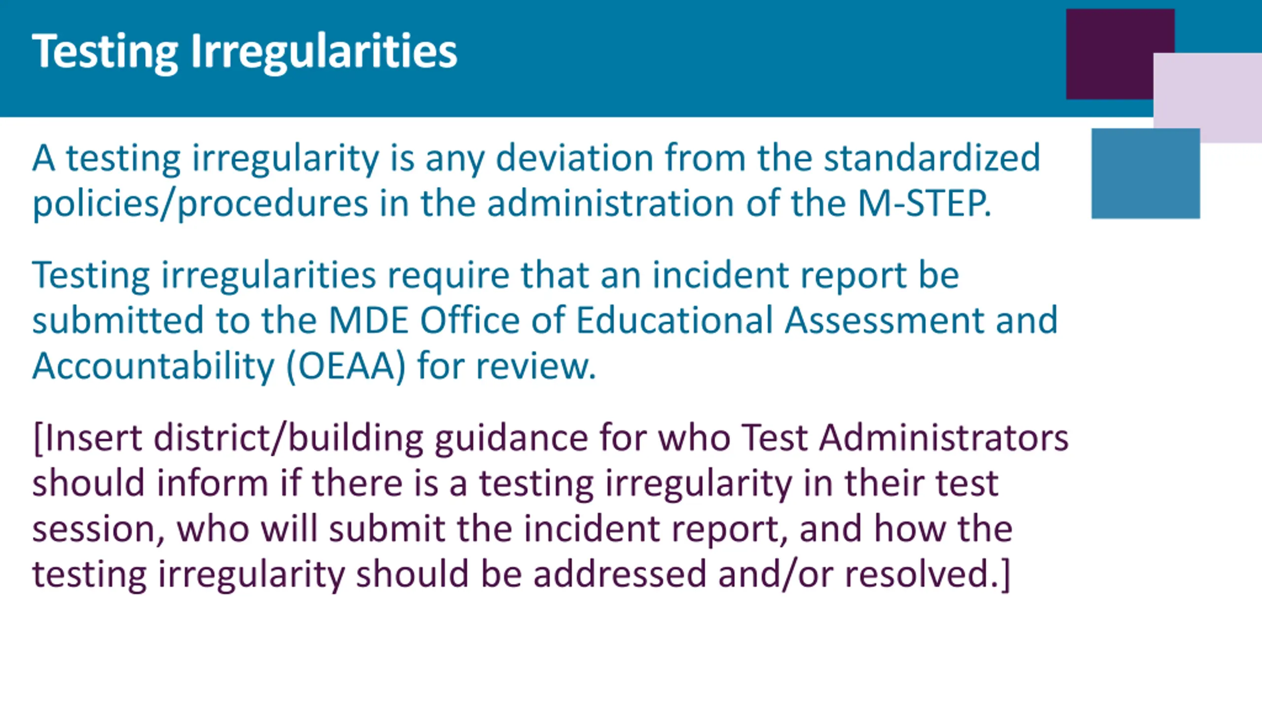 Testing Irregularities A testing irregularity is any deviation from the standardized policies/procedures in the administration of the M-STEP. Testing irregularities require that an incident report be submitted to the MDE Office of Educational Assessment and Accountability (OEAA) for review. [Insert district/building guidance for who Test Administrators should inform if there is a testing irregularity in their test session, who will submit the incident report, and how the testing irregularity should be addressed and/or resolved.]