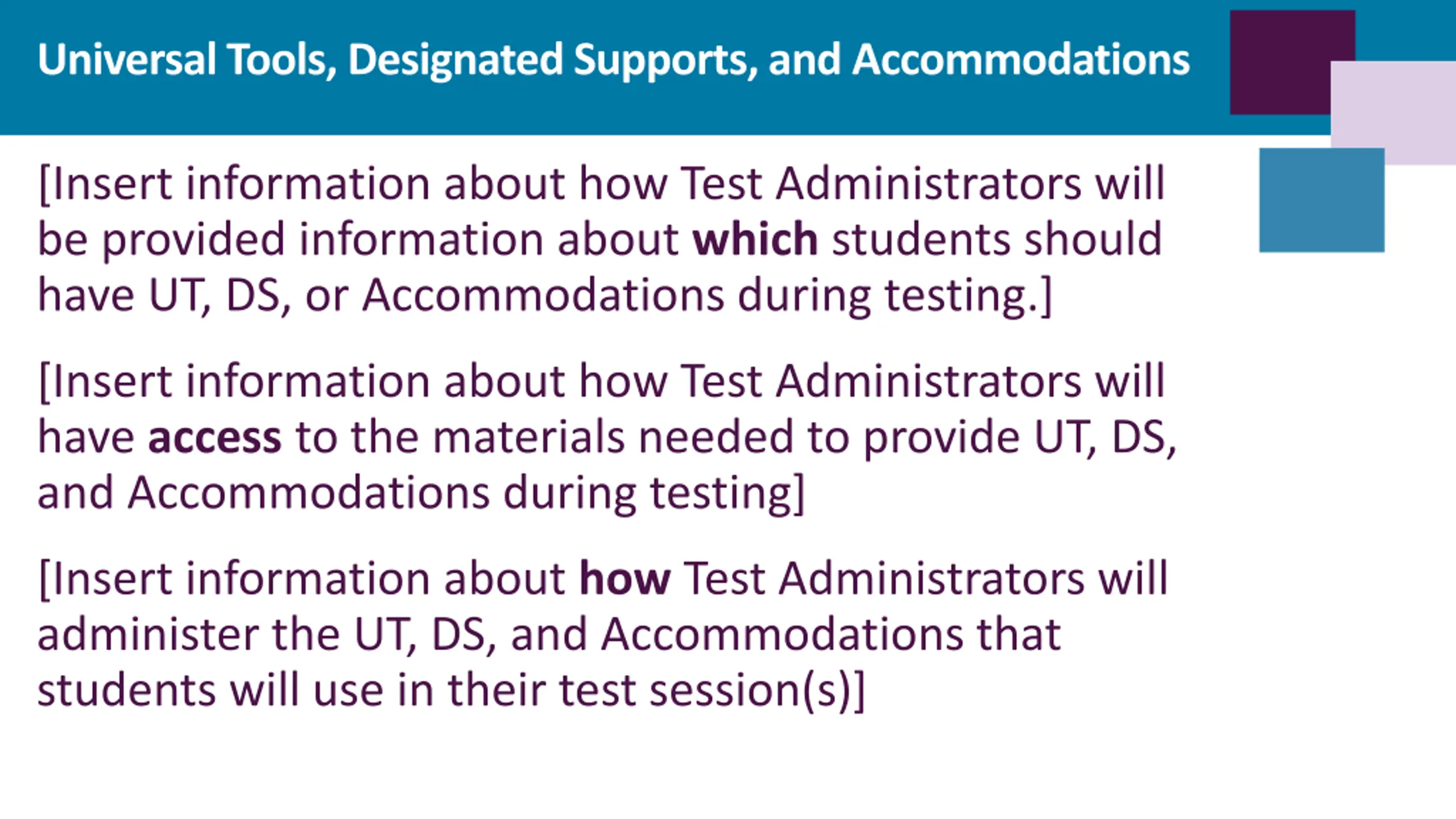 Universal Tools, Designated Supports, andAccommodations [Insert information about how Test Administrators will be provided information about which students should have UT, DS, or Accommodations during testing.] [Insert information about how Test Administrators will have access to the materials needed to provide UT, DS, and Accommodations during testing] [Insert information about how Test Administrators will administer the UT, DS, and Accommodations that students will use in their test session(s)]