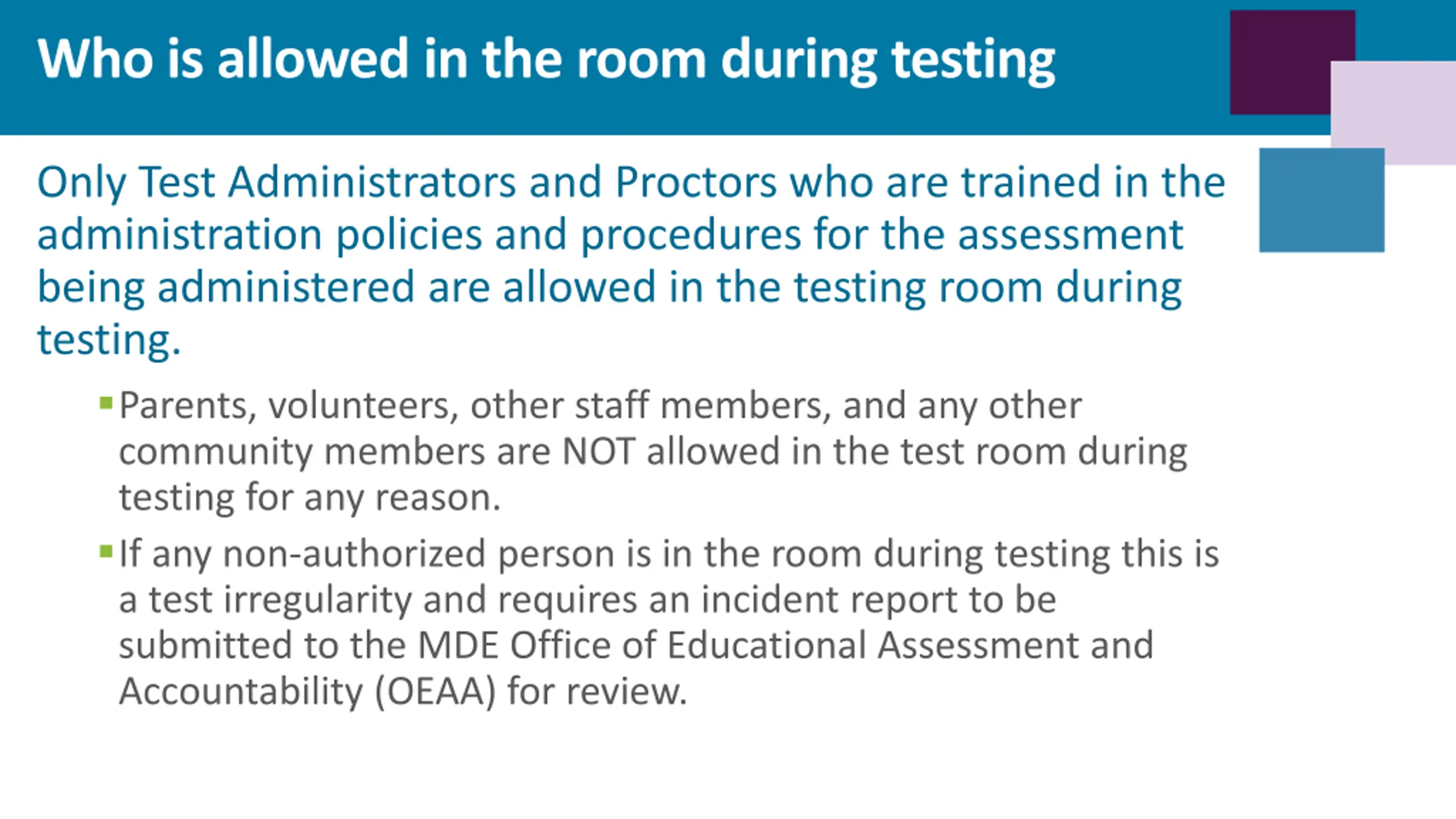 Who is allowed in the room during testing Only Test Administrators and Proctors who are trained in the administration policies and procedures for the assessment being administered are allowed in the testing room during testing. Parents, volunteers, other staff members, and any other community members are NOT allowed in the test room during testing for any reason. If any non-authorized person is in the room during testing this is a test irregularity and requires an incident report to be submitted to the MDE Office of Educational Assessment and Accountability (OEAA) for review.