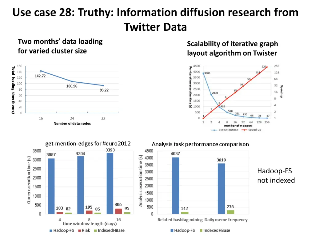 Use case 28: Truthy: Information diffusion research from Twitter Data Two months data loading for varied cluster size Scalability of iterative graph layout algorithm on Twister Hadoop-FS not indexed