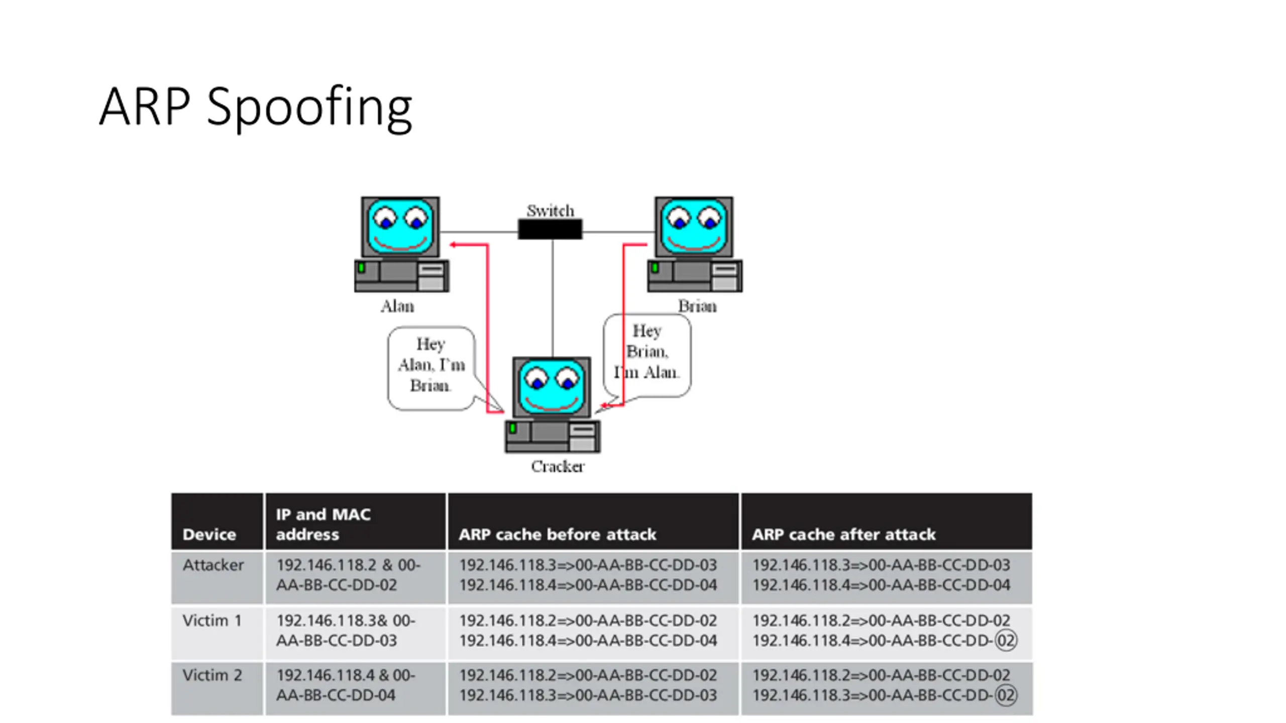 What is ARP Spoofing (ARP Poisoning) An ARP spoofing, also known as ARP poisoning, is a Man in the Middle (MitM) attack that allows attackers to intercept communication between network devices. The attack works as follows: The attacker must have access to the network. They scan the network to determine the IP addresses of at least two devices let s say these are a workstation and a router. The attacker uses a spoofing tool, such as Arpspoof or Driftnet, to send out forged ARP responses. The forged responses advertise that the correct MAC address for both IP addresses, belonging to the router and workstation, is the attacker s MAC address. This fools both router and workstation to connect to the attacker s machine, instead of to each other. The two devices update their ARP cache entries and from that point onwards, communicate with the attacker instead of directly with each other. The attacker is now secretly in the middle of all communications.