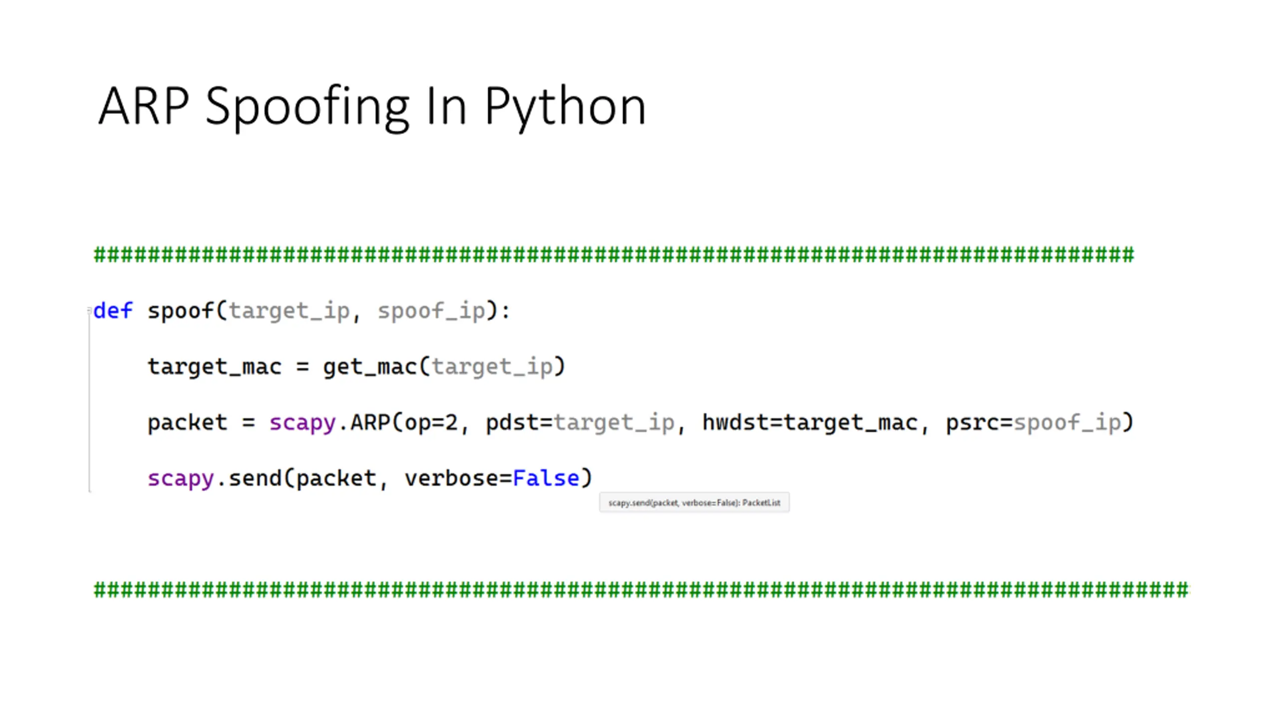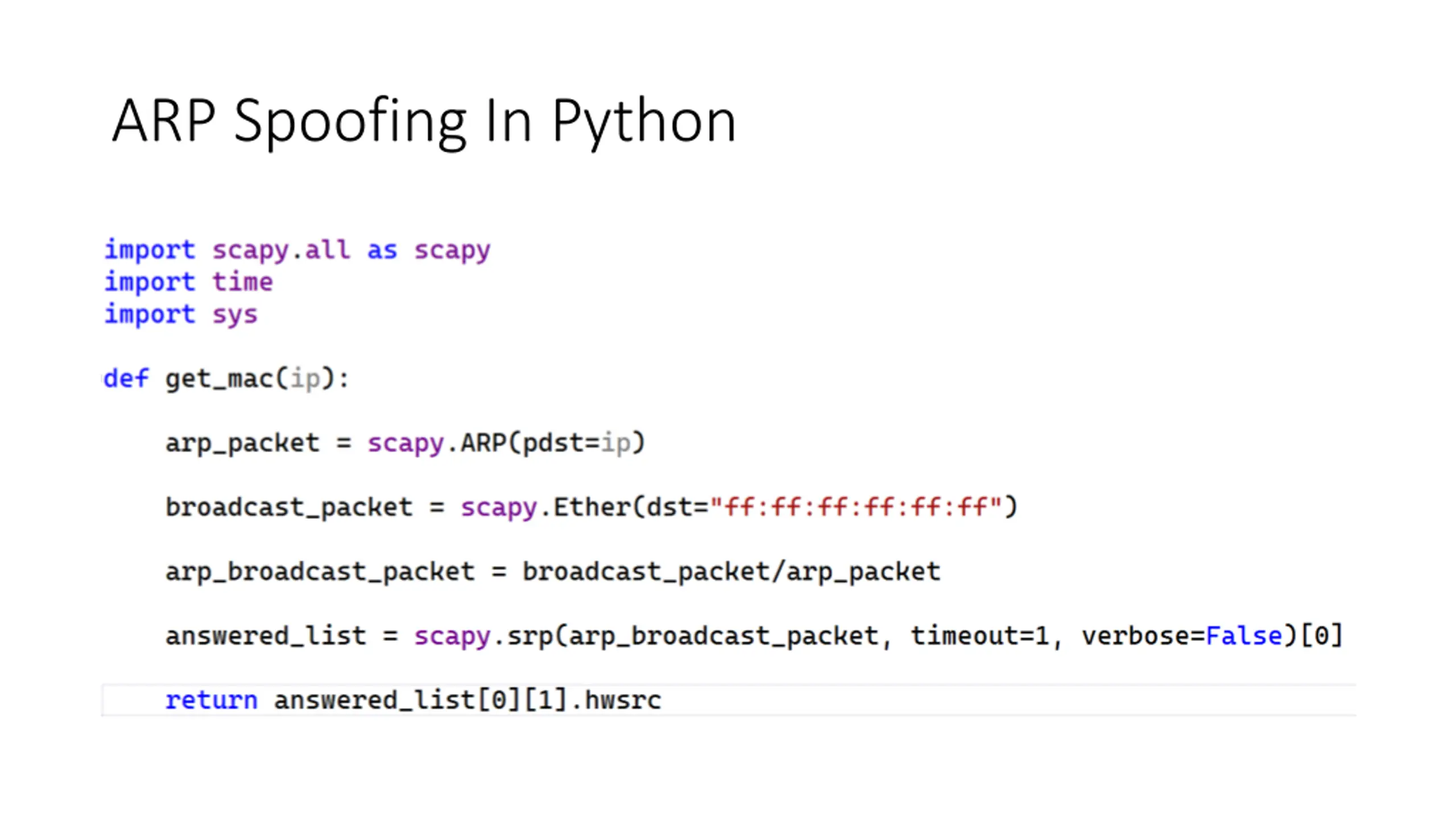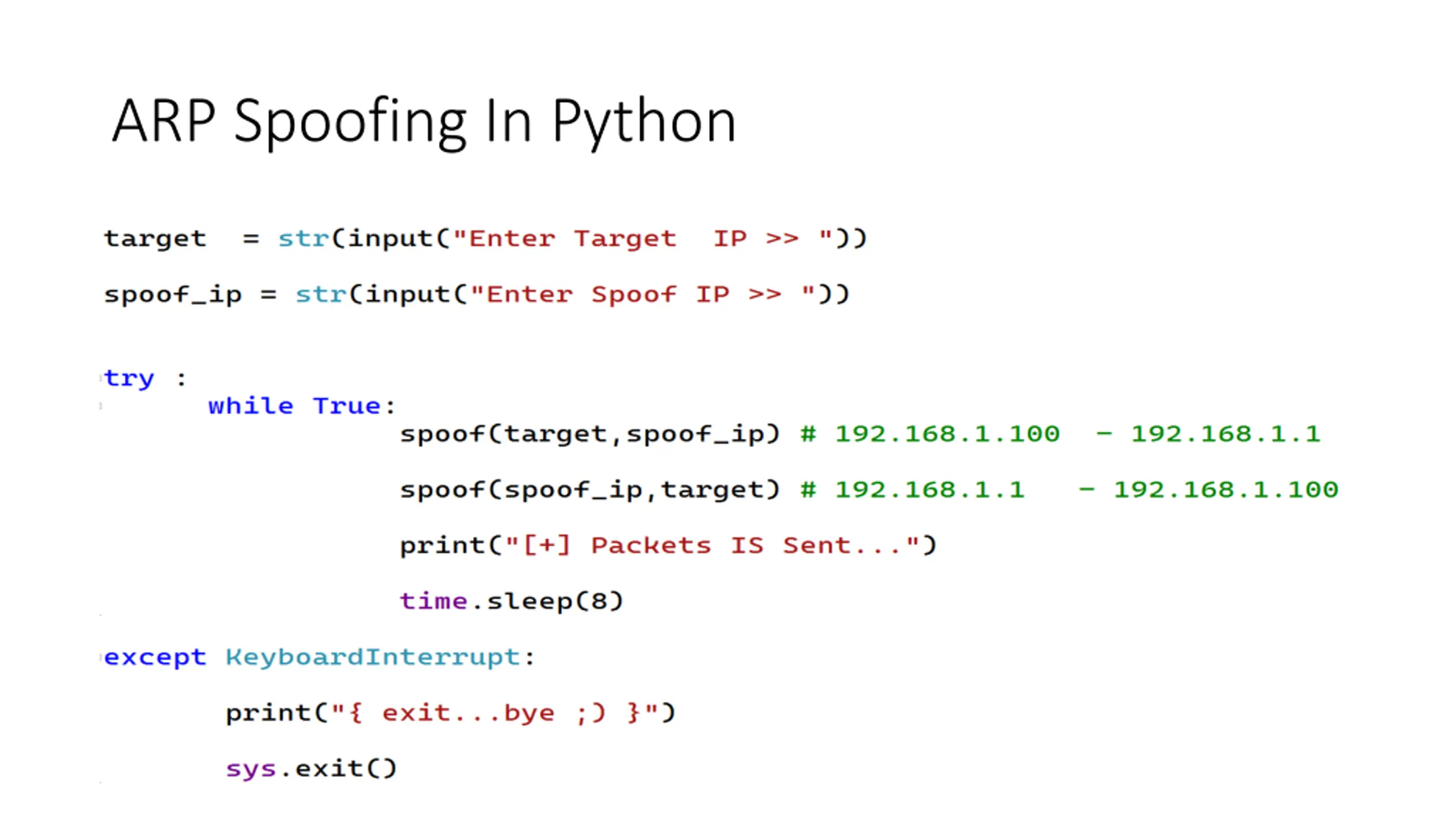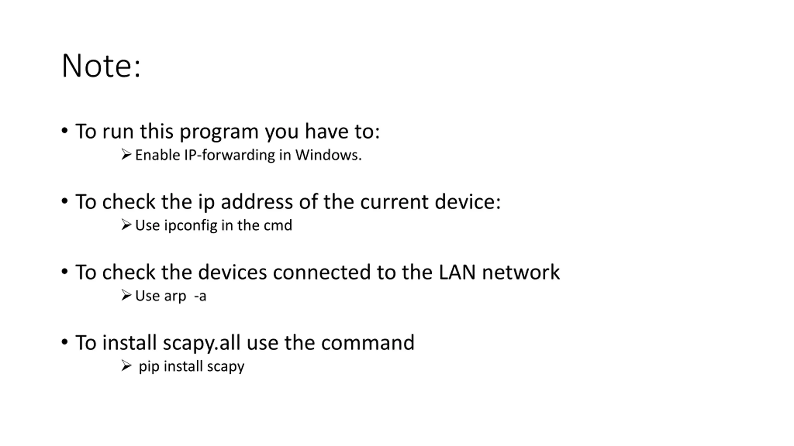 Note: To run this program you have to: Enable IP-forwarding in Windows. To check the ip address of the current device: Use ipconfig in the cmd To check the devices connected to the LAN network Use arp -a To install scapy.all use the command pip install scapy
