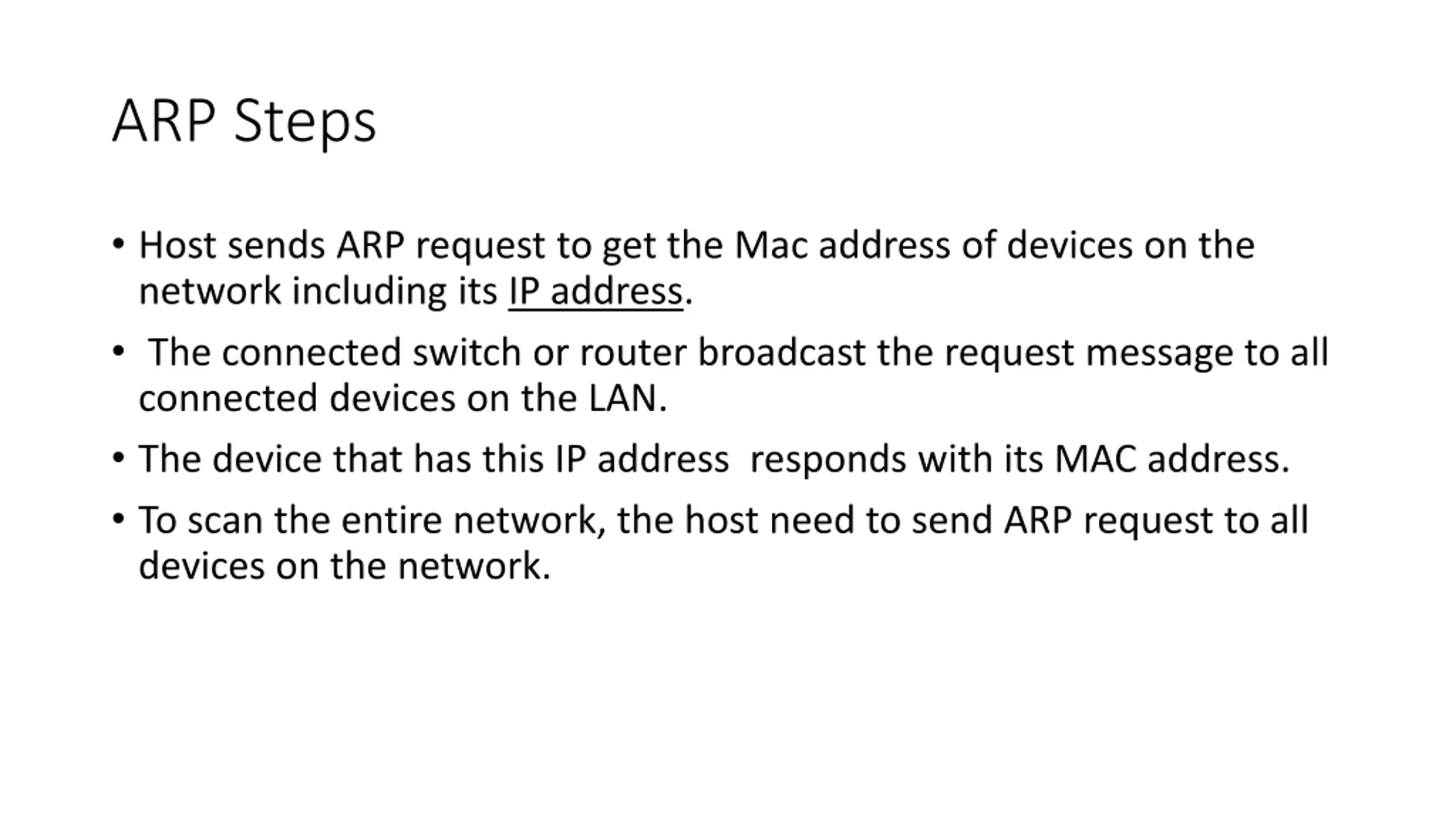 ARP Steps Host sends ARP request to get the Mac address of devices on the network including its IP address. The connected switch or router broadcast the request message to all connected devices on the LAN. The device that has this IP address responds with its MAC address. To scan the entire network, the host need to send ARP request to all devices on the network.