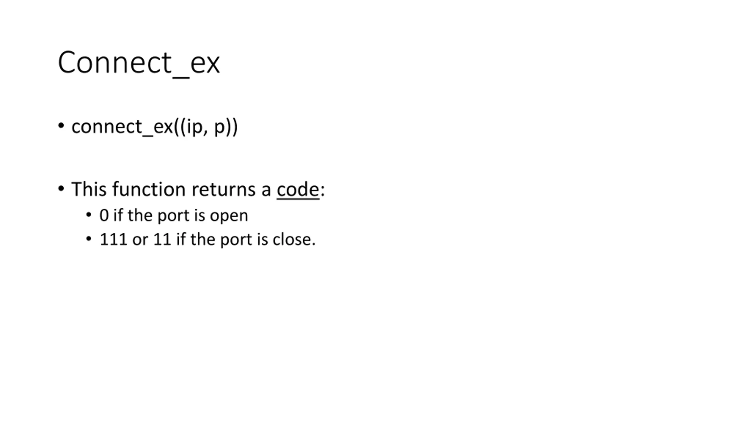 Connect_ex connect_ex((ip, p)) This function returns a code: 0 if the port is open 111 or 11 if the port is close.