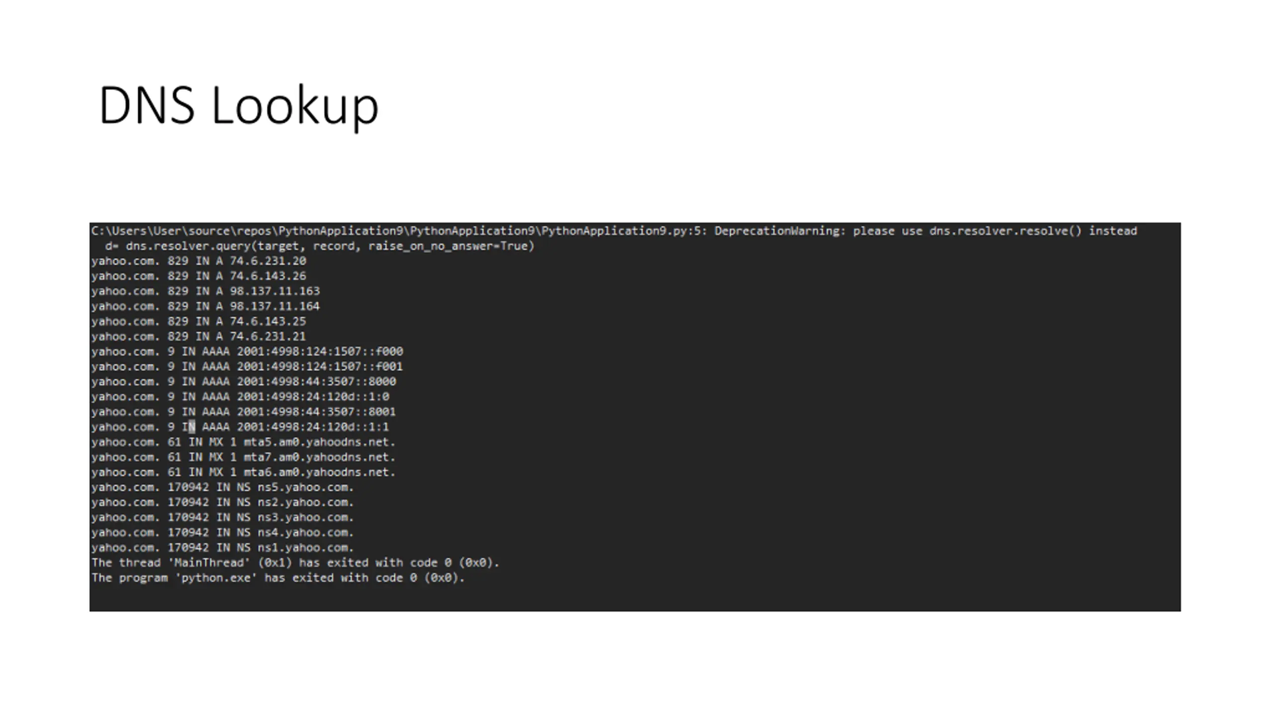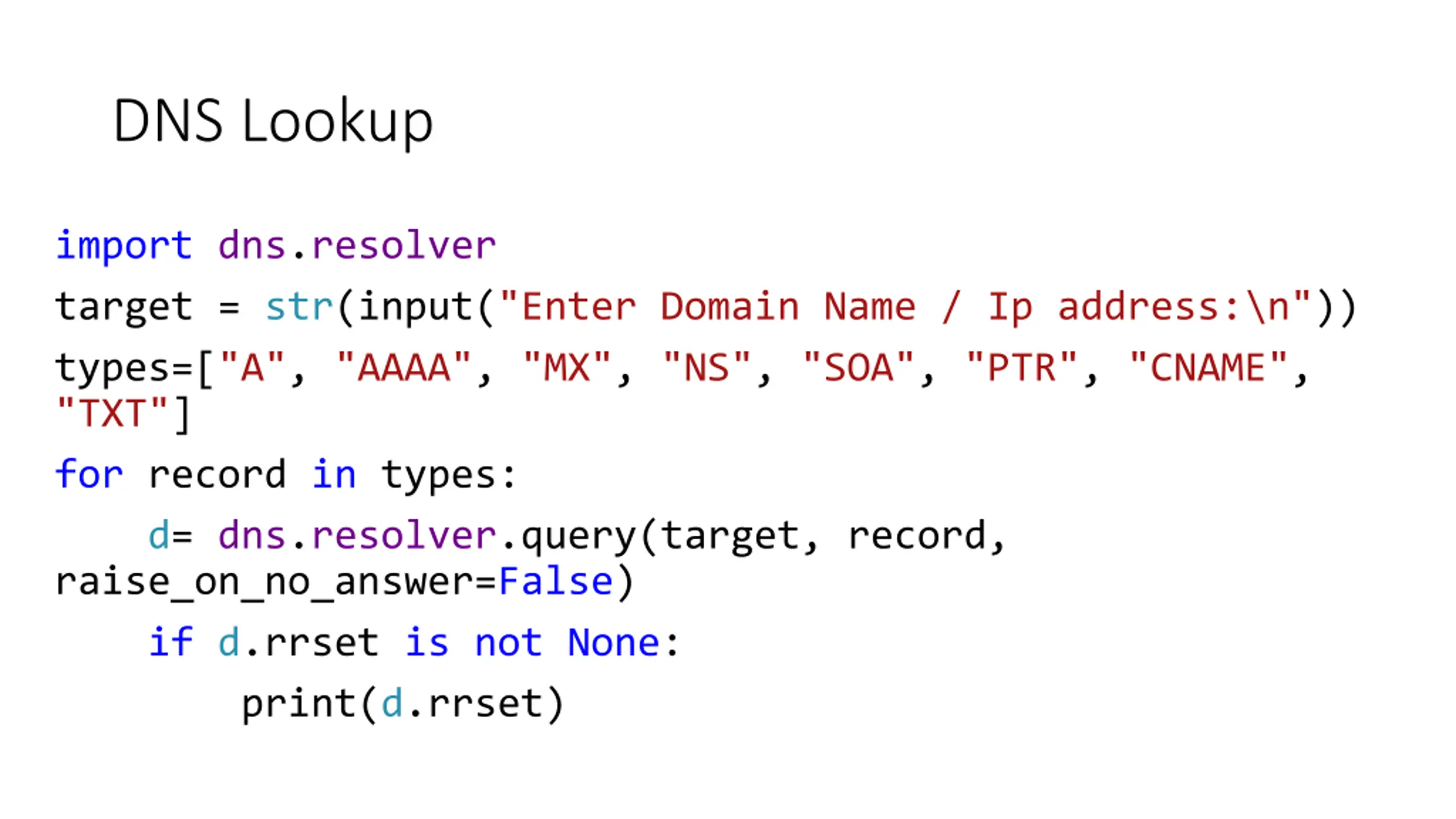 DNS Lookup import dns.resolver target = str(input("Enter Domain Name / Ip address:\n")) types=["A", "AAAA", "MX", "NS", "SOA", "PTR", "CNAME", "TXT"] for record in types: d= dns.resolver.query(target, record, raise_on_no_answer=False) if d.rrset is not None: print(d.rrset)