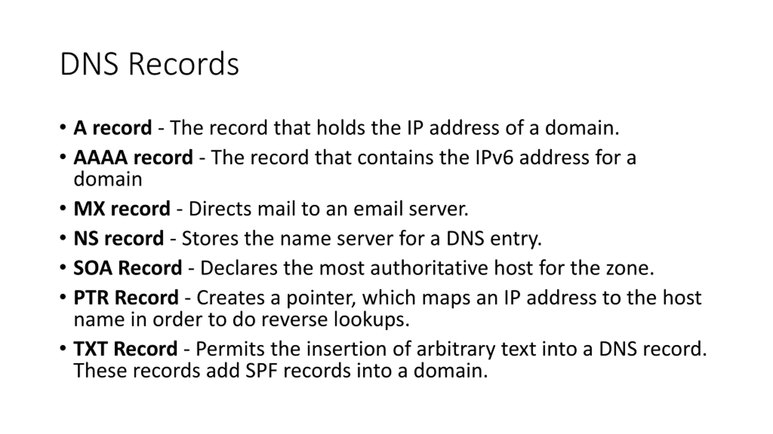 DNS Records A record - The record that holds the IP address of a domain. AAAA record - The record that contains the IPv6 address for a domain MX record - Directs mail to an email server. NS record - Stores the name server for a DNS entry. SOA Record - Declares the most authoritative host for the zone. PTR Record - Creates a pointer, which maps an IP address to the host name in order to do reverse lookups. TXT Record - Permits the insertion of arbitrary text into a DNS record. These records add SPF records into a domain.