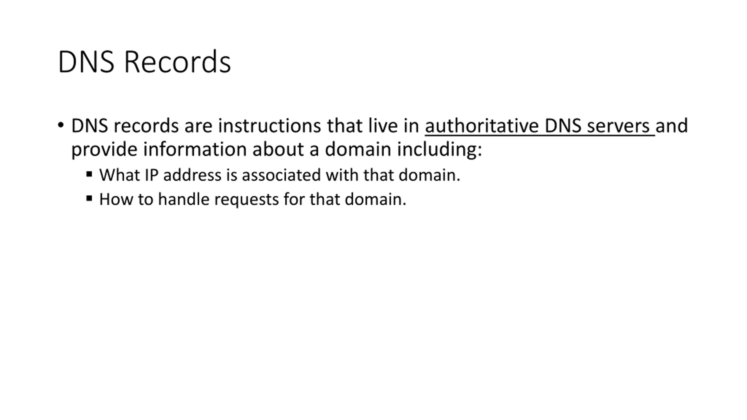 DNS Records DNS records are instructions that live in authoritative DNS servers and provide information about a domain including: What IP address is associated with that domain. How to handle requests for that domain.