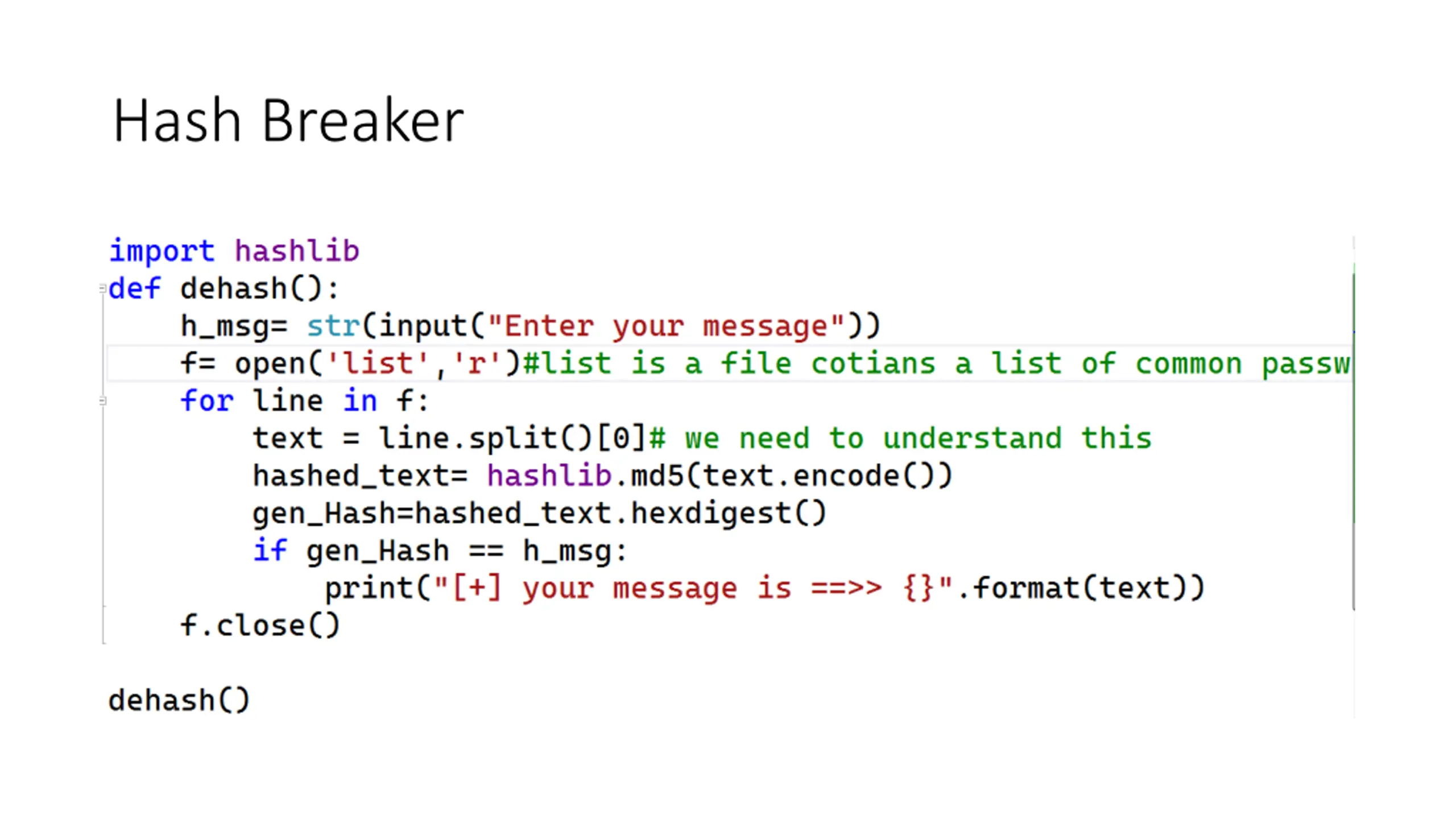 Hash Breaker In this work we introduce a hash breaker function that mainly utilizes the Dictionary Method.
