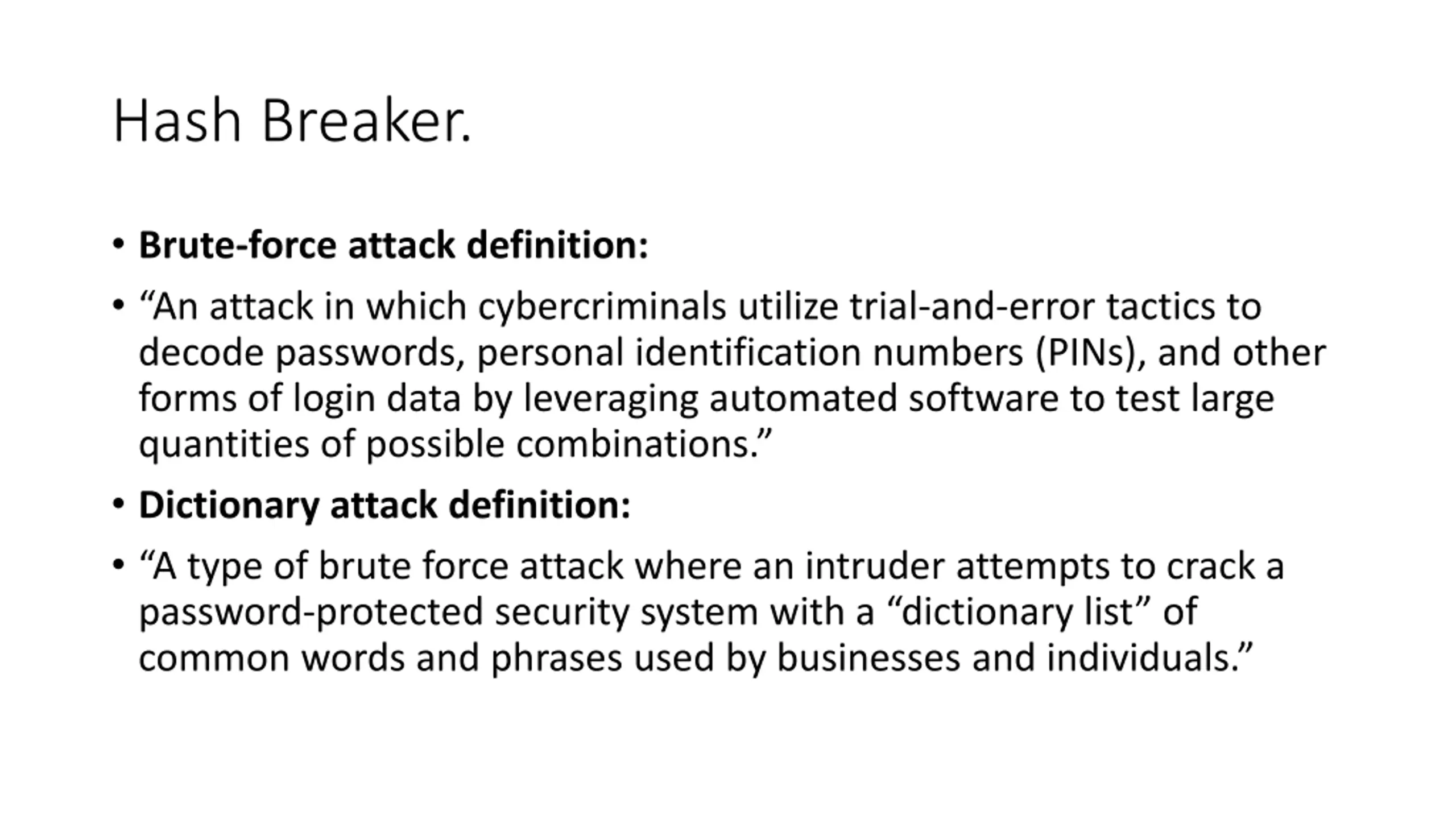 Hash Breaker. Brute-force attack definition: An attack in which cybercriminals utilize trial-and-error tactics to decode passwords, personal identification numbers (PINs), and other forms of login data by leveraging automated software to test large quantities of possible combinations. Dictionary attack definition: A type of brute force attack where an intruder attempts to crack a password-protected security system with a dictionary list of common words and phrases used by businesses and individuals.