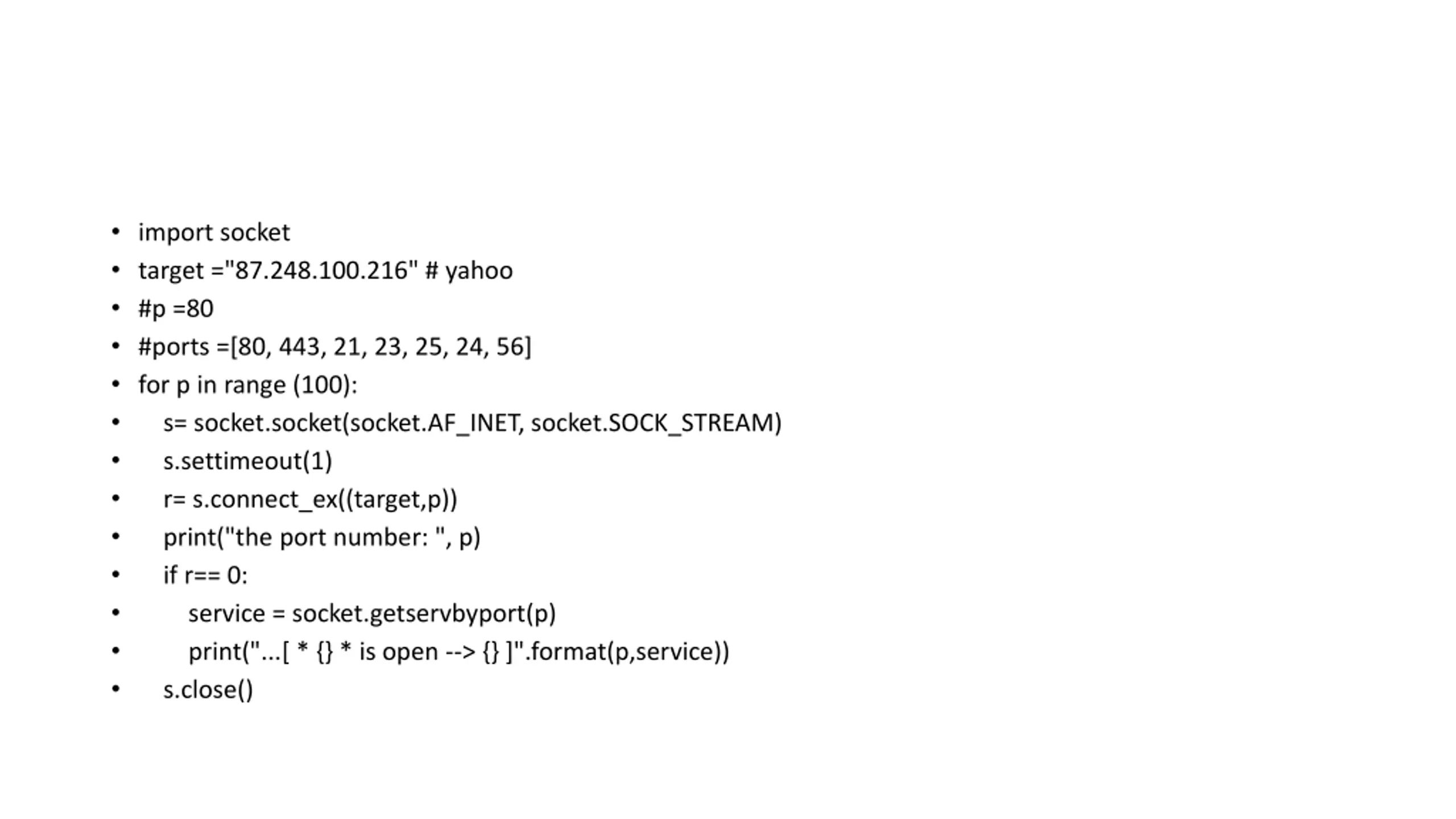 import socket target ="87.248.100.216" # yahoo #p =80 #ports =[80, 443, 21, 23, 25, 24, 56] for p in range (100): s= socket.socket(socket.AF_INET, socket.SOCK_STREAM) s.settimeout(1) r= s.connect_ex((target,p)) print("the port number: ", p) if r== 0: service = socket.getservbyport(p) print("...[ * {} * is open --> {} ]".format(p,service)) s.close()