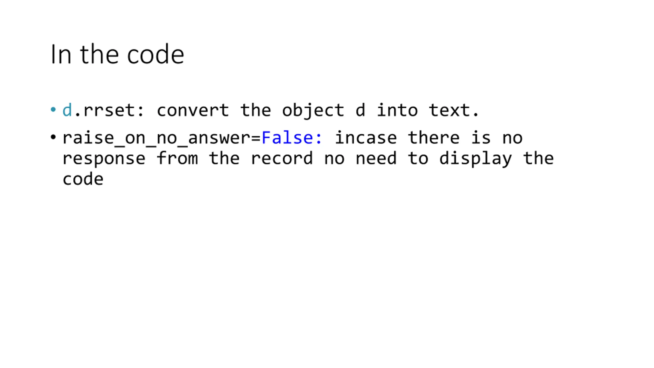 In the code d.rrset: convert the object d into text. raise_on_no_answer=False: incase there is no response from the record no need to display the code