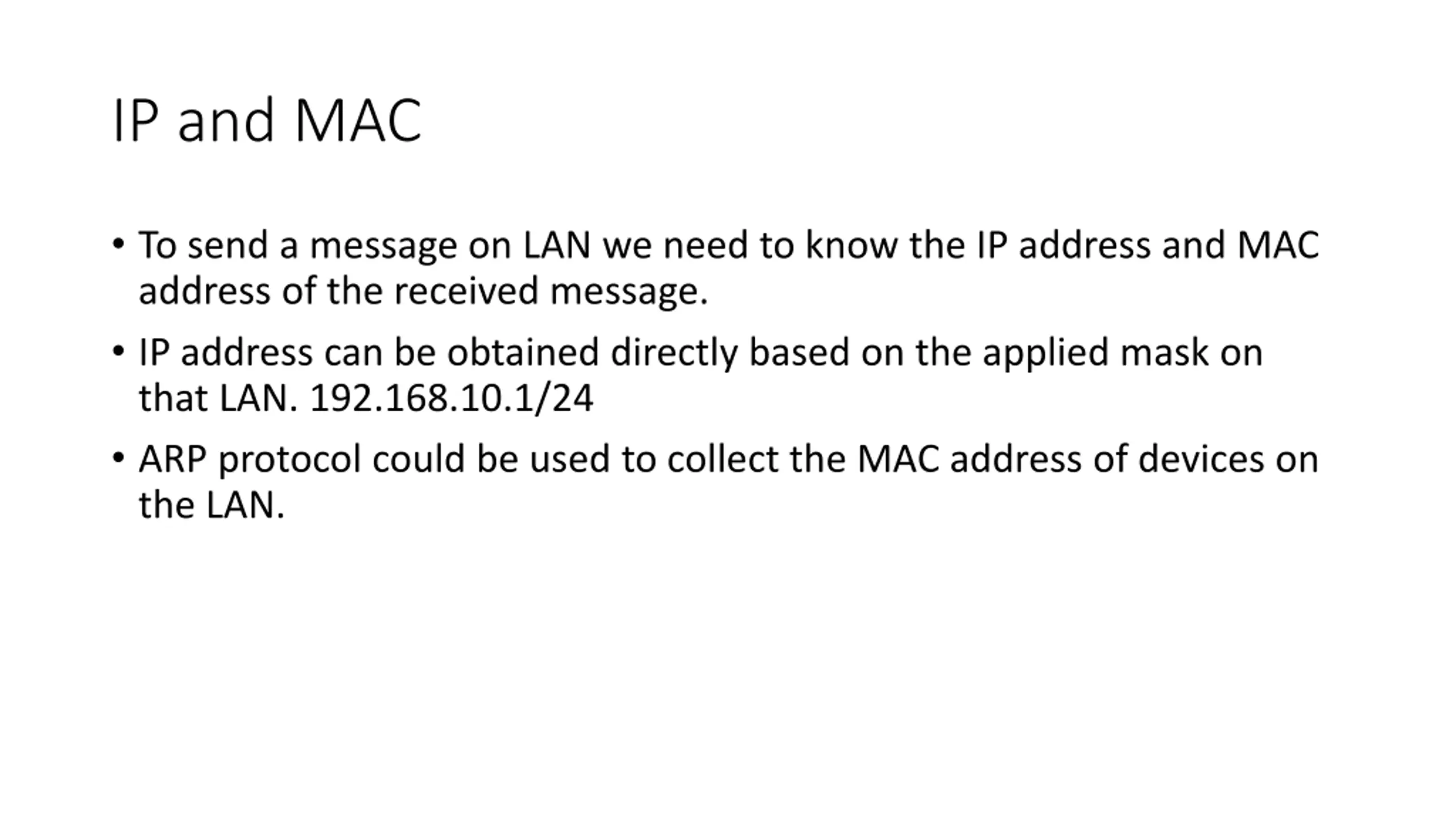 IP and MAC To send a message on LAN we need to know the IP address and MAC address of the received message. IP address can be obtained directly based on the applied mask on that LAN. 192.168.10.1/24 ARP protocol could be used to collect the MAC address of devices on the LAN.