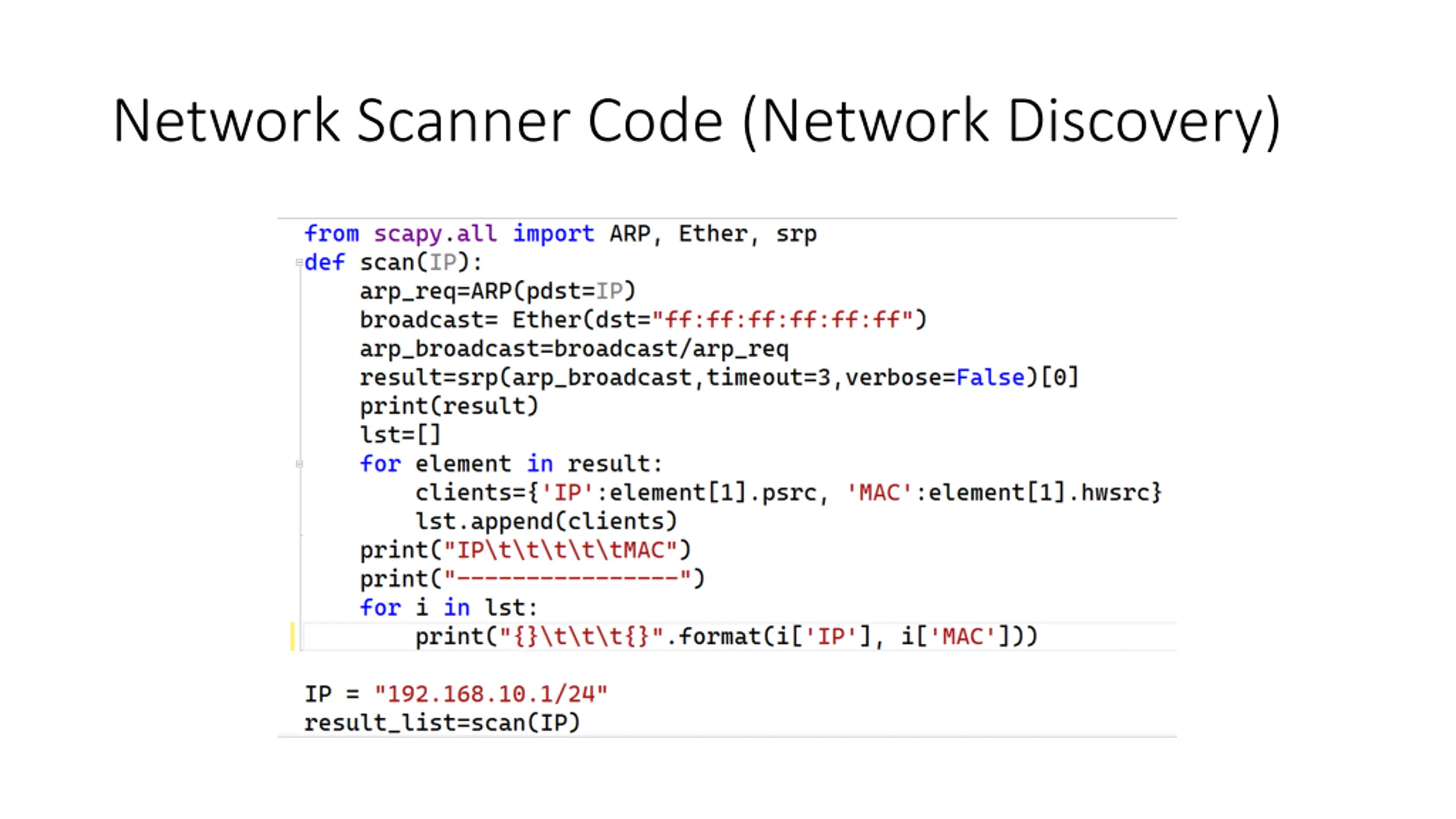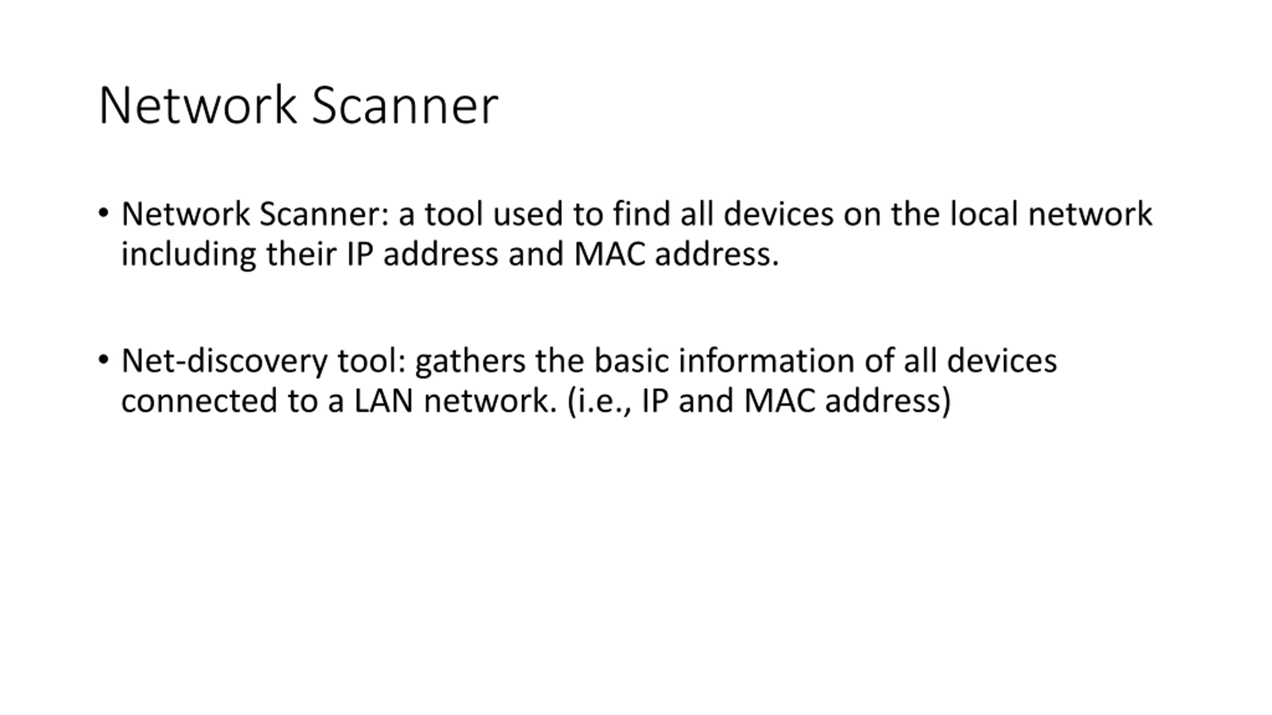 Network Scanner Network Scanner: a tool used to find all devices on the local network including their IP address and MAC address. Net-discovery tool: gathers the basic information of all devices connected to a LAN network. (i.e., IP and MAC address)