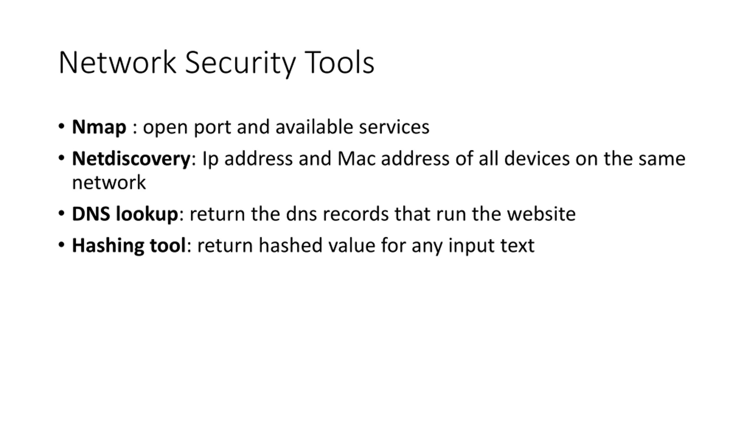 Network Security Tools Nmap : open port and available services Netdiscovery: Ip address and Mac address of all devices on the same network DNS lookup: return the dns records that run the website Hashing tool: return hashed value for any input text