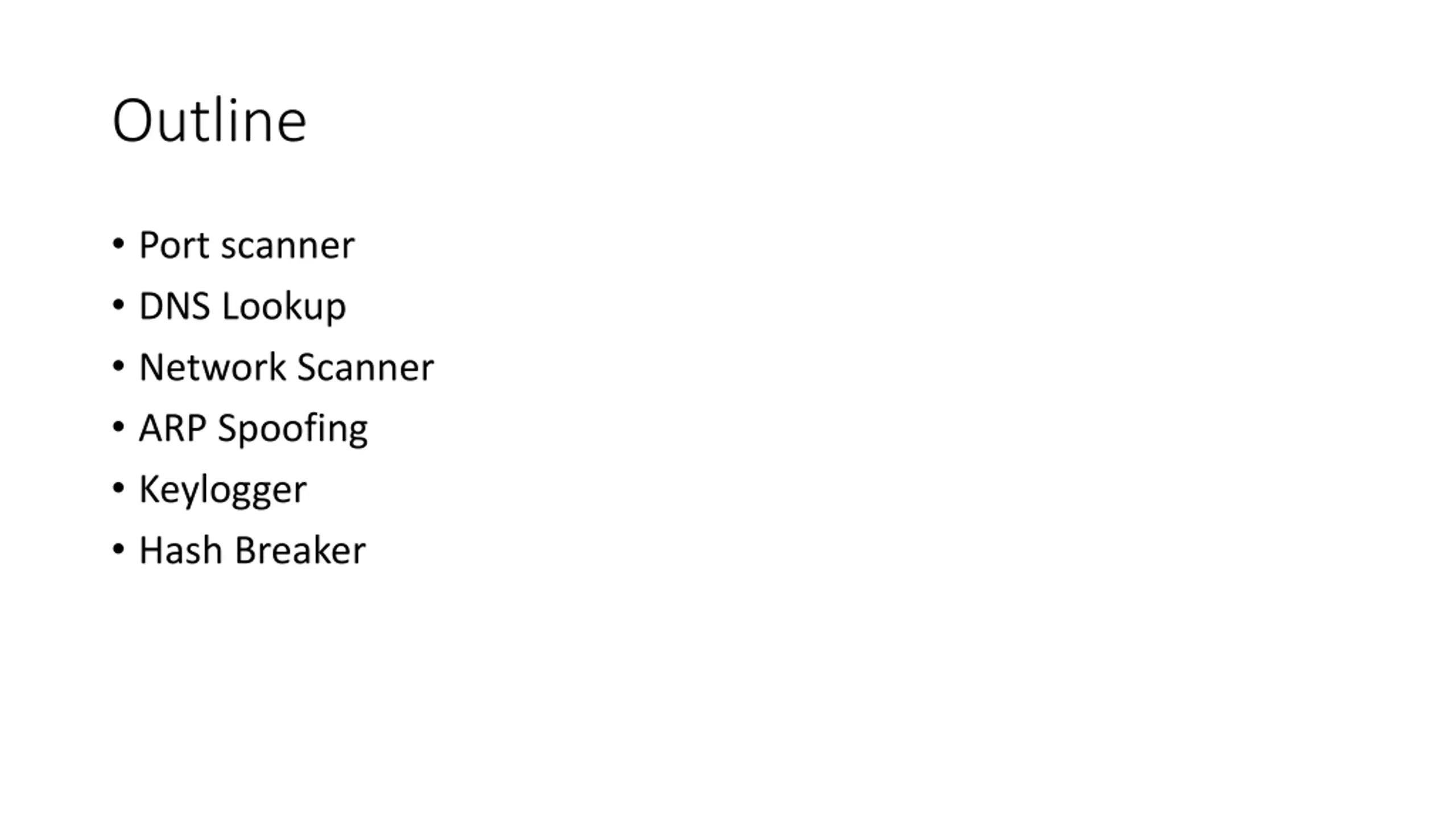 Outline Port scanner DNS Lookup Network Scanner ARP Spoofing Keylogger Hash Breaker