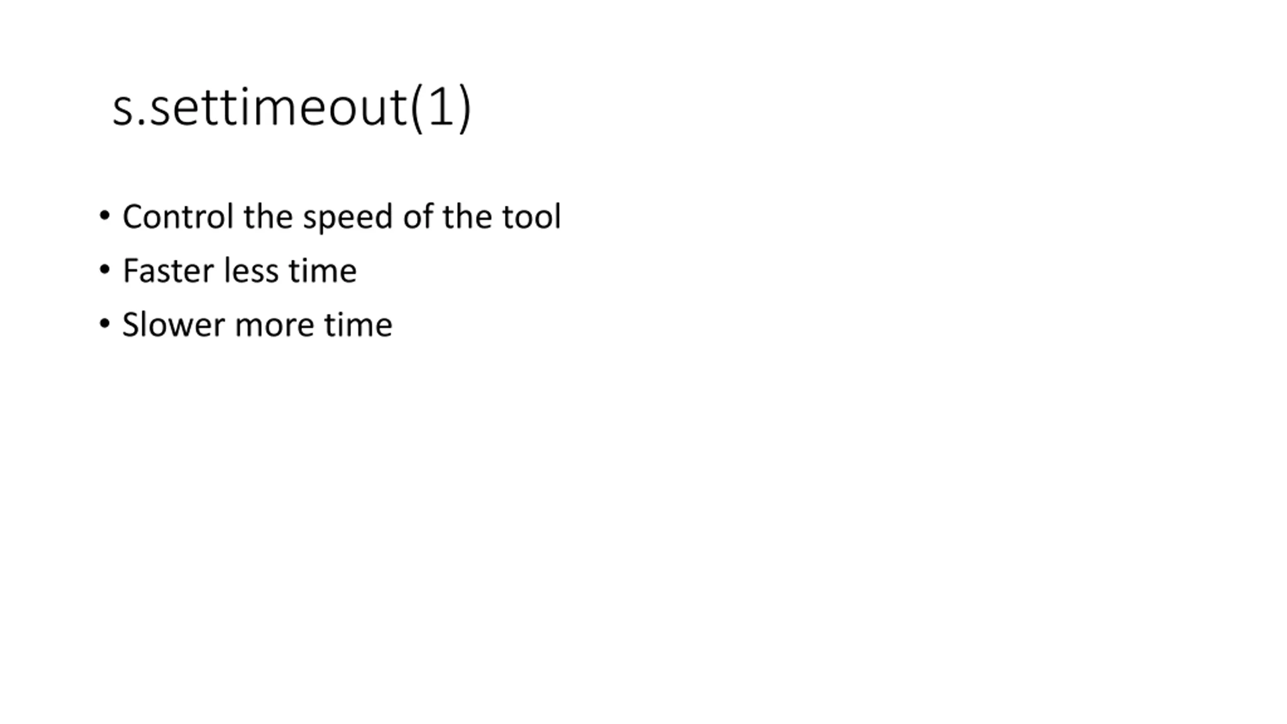 s.settimeout(1) Control the speed of the tool Faster less time Slower more time