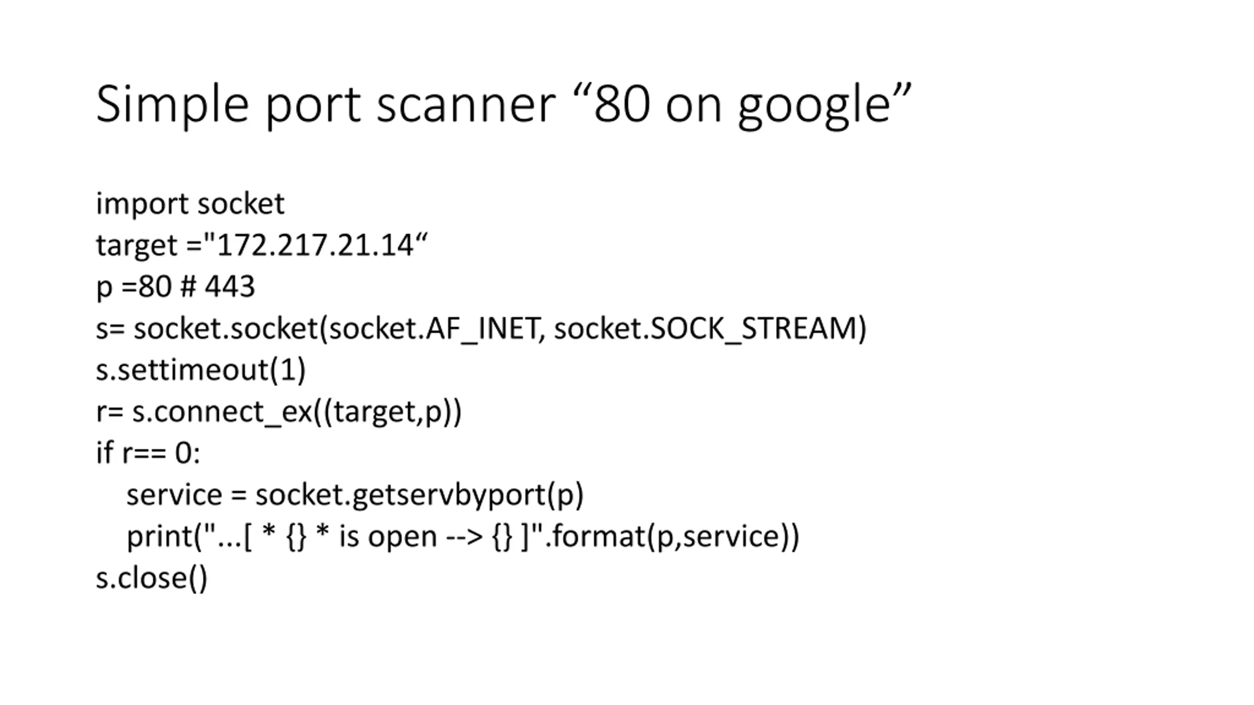 Simple port scanner 80 on google import socket target ="172.217.21.14 p =80 # 443 s= socket.socket(socket.AF_INET, socket.SOCK_STREAM) s.settimeout(1) r= s.connect_ex((target,p)) if r== 0: service = socket.getservbyport(p) print("...[ * {} * is open --> {} ]".format(p,service)) s.close()