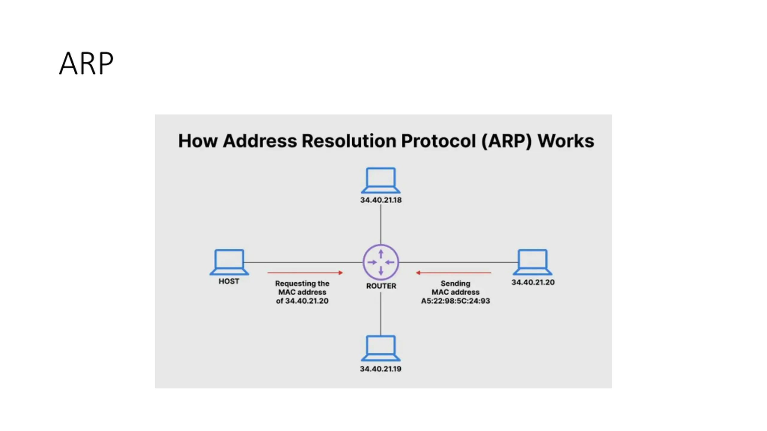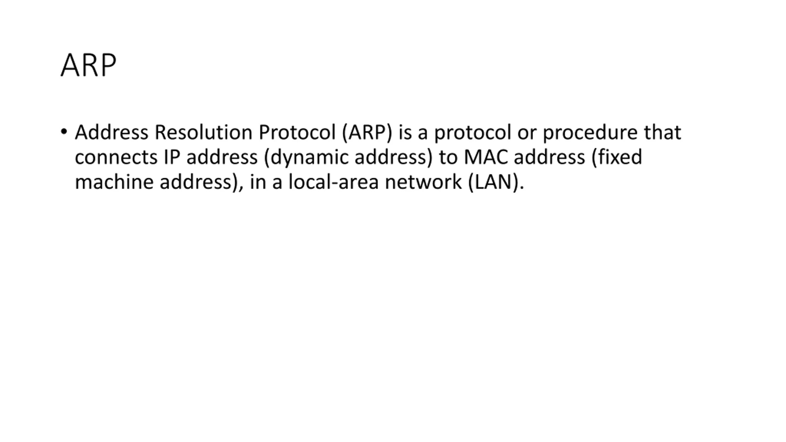 ARP Address Resolution Protocol (ARP) is a protocol or procedure that connects IP address (dynamic address) to MAC address (fixed machine address), in a local-area network (LAN).