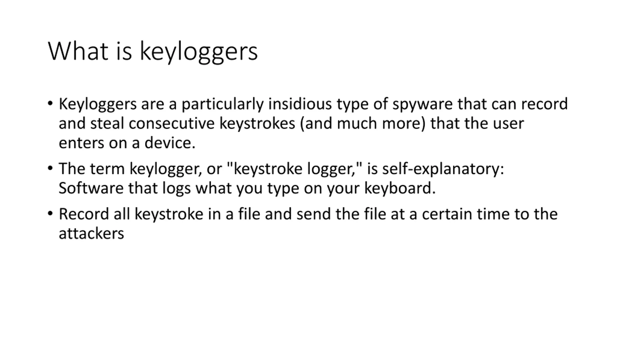 What is keyloggers Keyloggers are a particularly insidious type of spyware that can record and steal consecutive keystrokes (and much more) that the user enters on a device. The term keylogger, or "keystroke logger," is self-explanatory: Software that logs what you type on your keyboard. Record all keystroke in a file and send the file at a certain time to the attackers