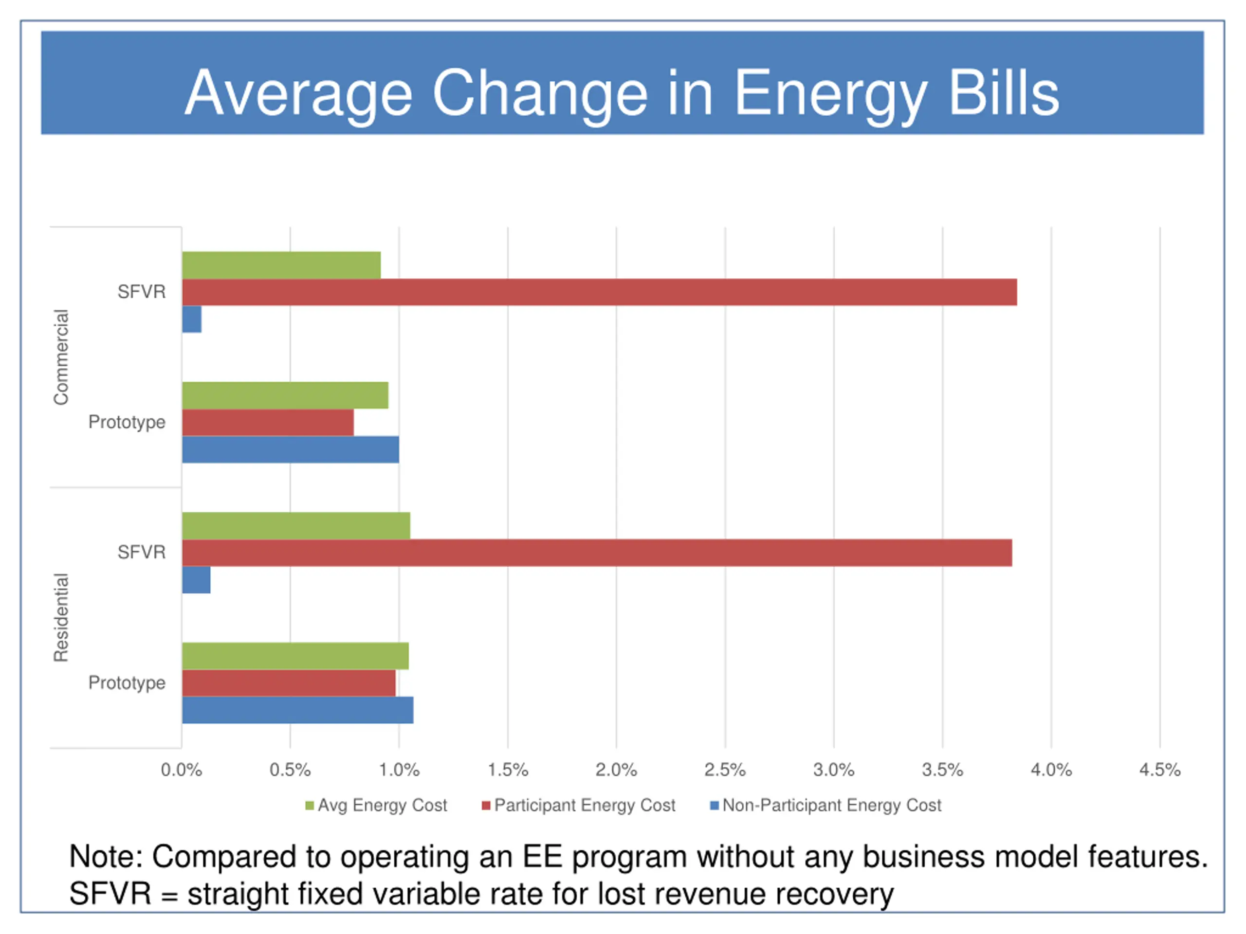 Average Change in Energy Bills SFVR Commercial Prototype SFVR Residential Prototype 0.0% 0.5% 1.0% 1.5% 2.0% 2.5% 3.0% 3.5% 4.0% 4.5% Avg Energy Cost Participant Energy Cost Non-Participant Energy Cost Note: Compared to operating an EE program without any business model features. SFVR = straight fixed variable rate for lost revenue recovery
