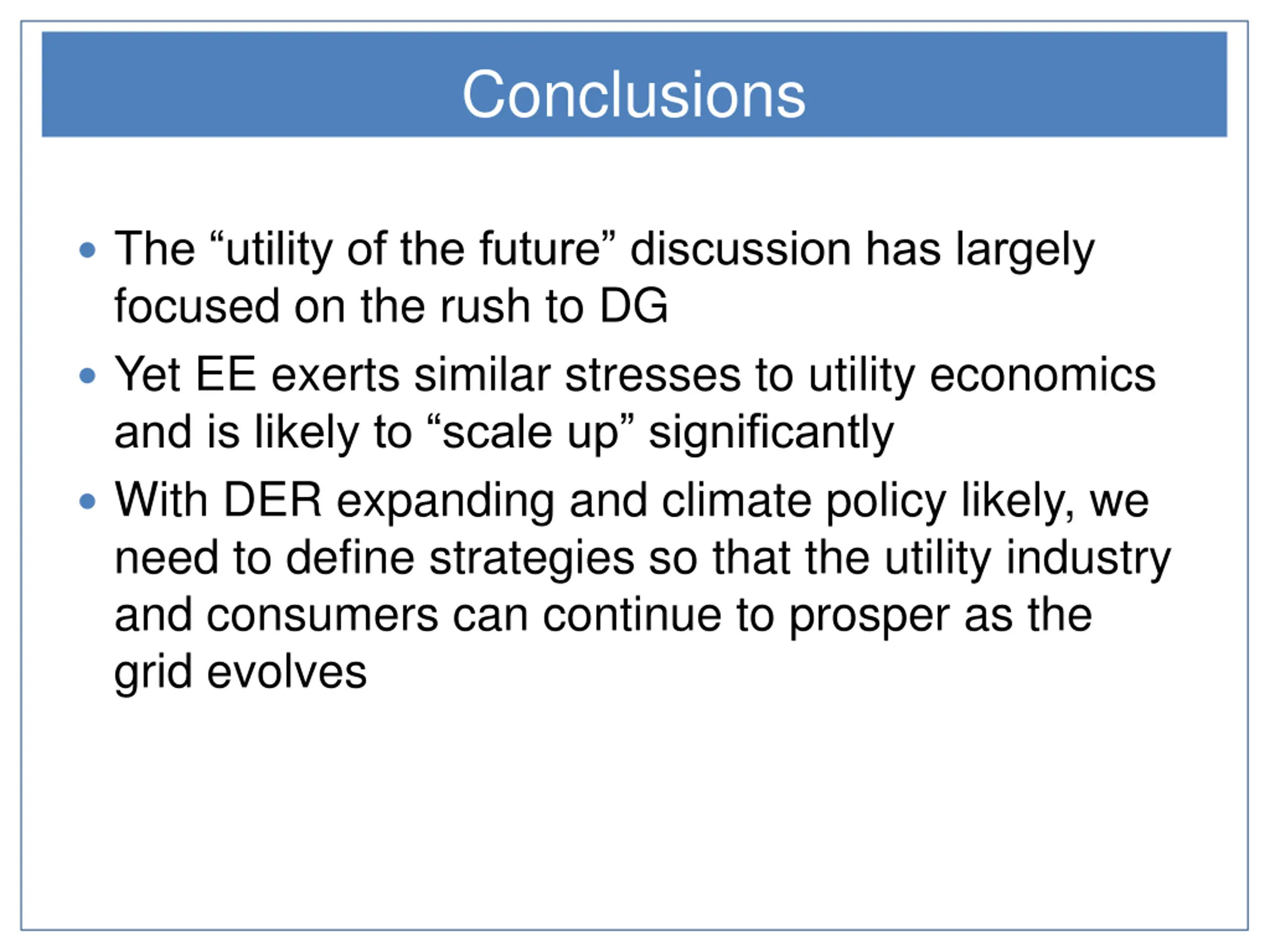 Conclusions The utility of the future discussion has largely focused on the rush to DG Yet EE exerts similar stresses to utility economics and is likely to scale up significantly With DER expanding and climate policy likely, we need to define strategies so that the utility industry and consumers can continue to prosper as the grid evolves