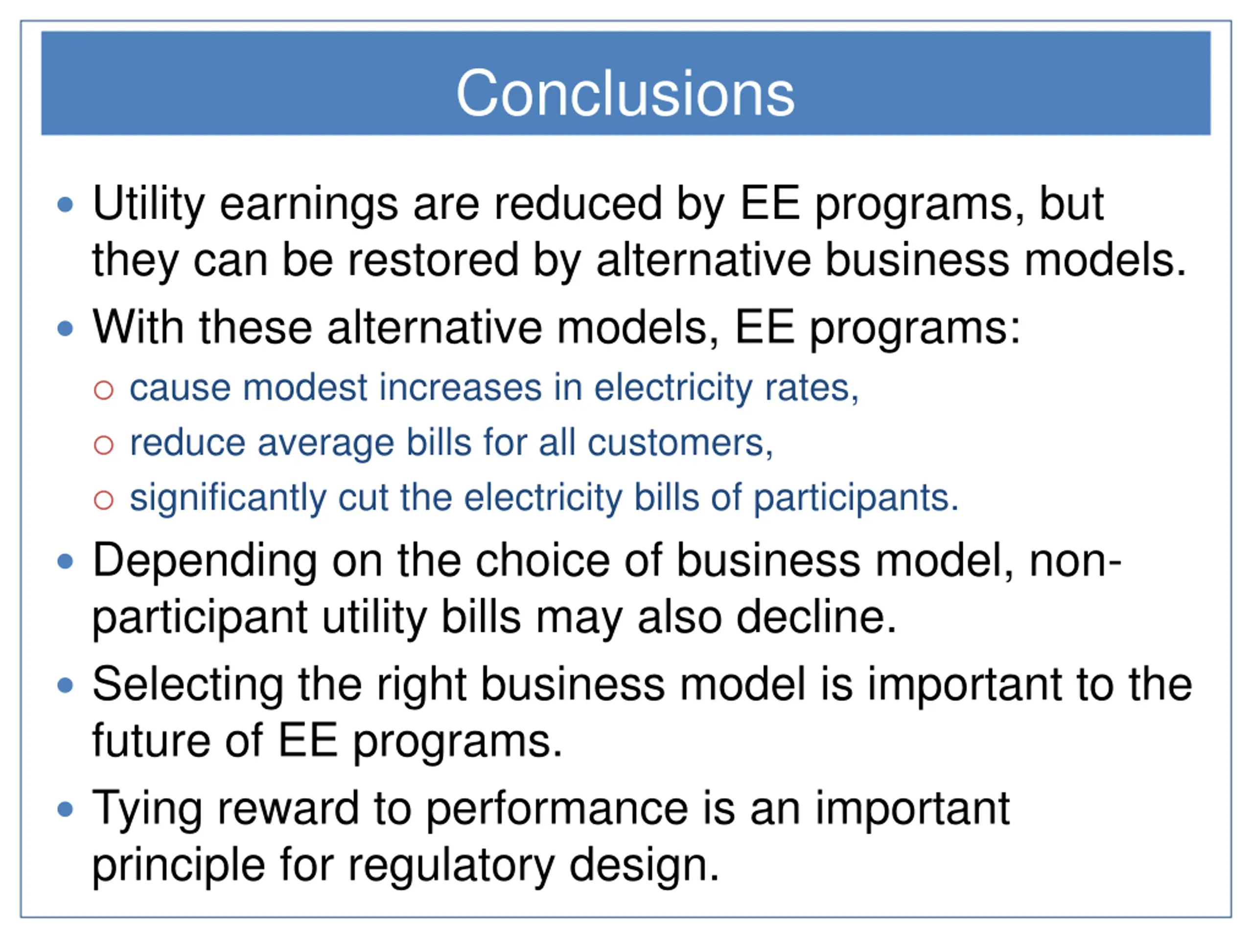 Conclusions Utility earnings are reduced by EE programs, but they can be restored by alternative business models. With these alternative models, EE programs: cause modest increases in electricity rates, reduce average bills for all customers, significantly cut the electricity bills of participants. Depending on the choice of business model, non- participant utility bills may also decline. Selecting the right business model is important to the future of EE programs. Tying reward to performance is an important principle for regulatory design.