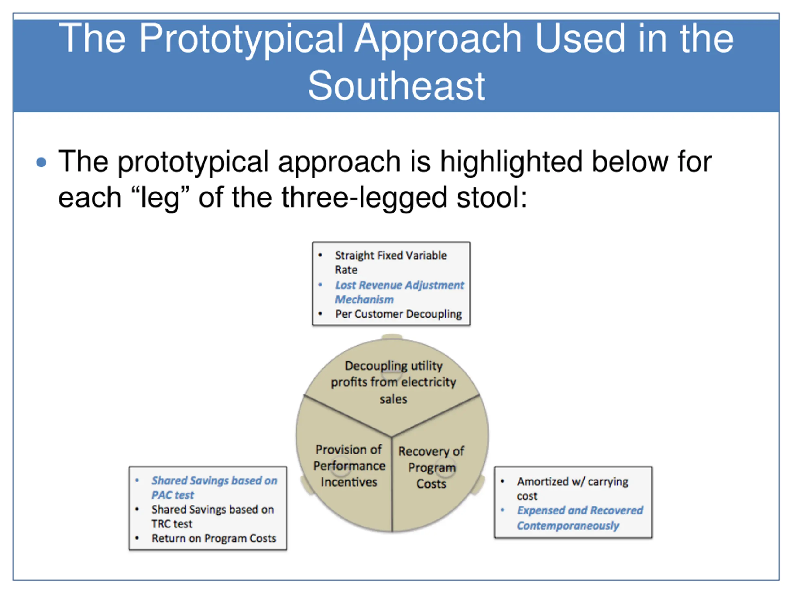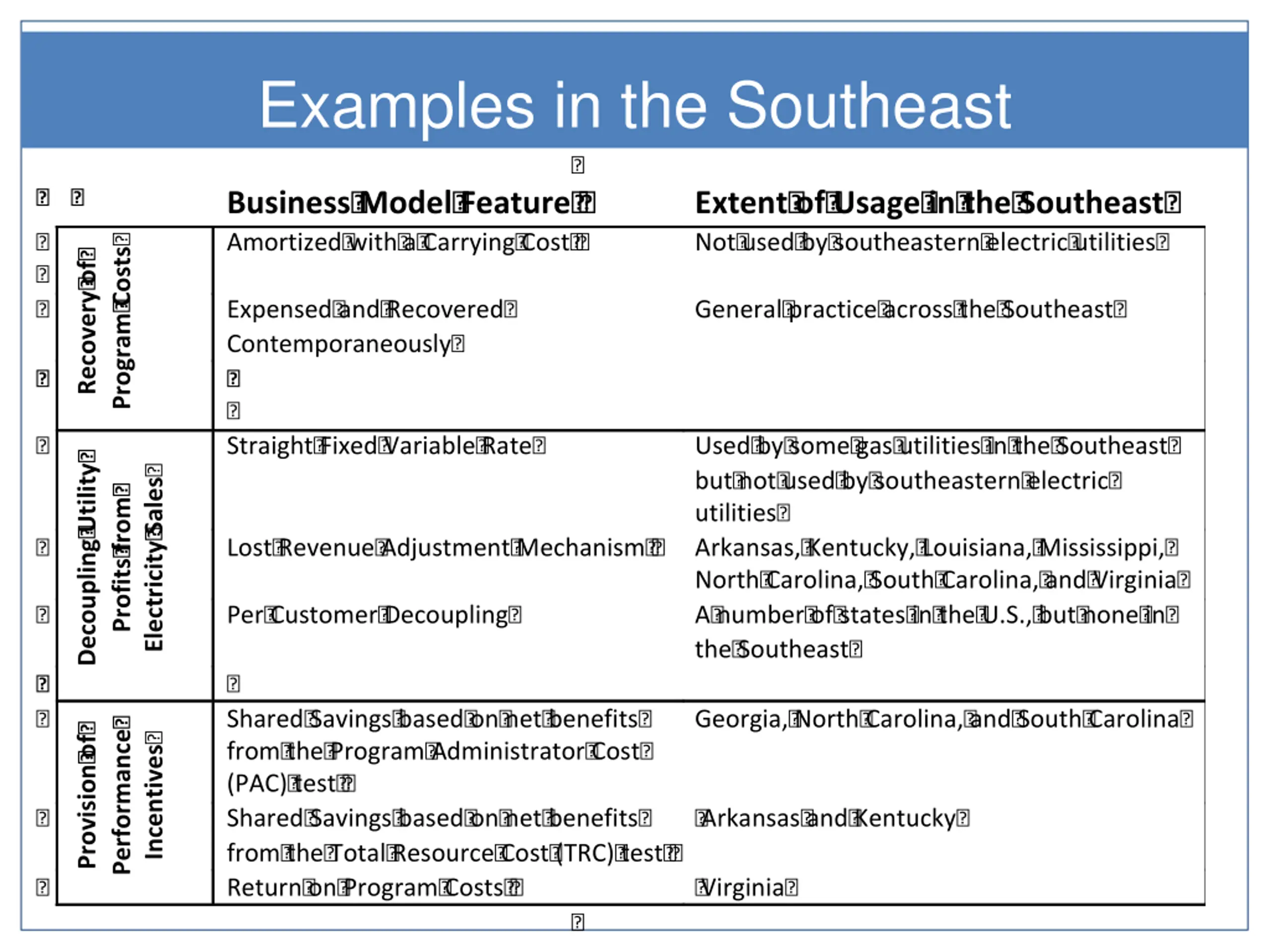Examples in the Southeast ? Business? Model? Feature? ? Amortized? with? a? Carrying? Cost? ? ? ? Extent? of? Usage? in? the? Southeast? Not? used? by? southeastern? electric? utilities? ? ? ? Program? Costs? Recovery? of? Expensed? and? Recovered? Contemporaneously? ? ? Straight? Fixed? Variable? Rate? General? practice? across? the? Southeast? ? ? Used? by? some? gas? utilities? in? the? Southeast? but? not? used? by? southeastern? electric? utilities? Arkansas,? Kentucky,? Louisiana,? Mississippi,? North? Carolina,? South? Carolina,? and? Virginia? A? number? of? states? in? the? U.S.,? but? none? in? the? Southeast? Decoupling? Utility? Electricity? Sales? Profits? from? ? Lost? Revenue? Adjustment? Mechanism? ? ? Per? Customer? Decoupling? ? ? ? Shared? Savings? based? on? net? benefits? from? the? Program? Administrator? Cost? (PAC)? test? ? Shared? Savings? based? on? net? benefits? from? the? Total? Resource? Cost? (TRC)? test? ? Return? on? Program? Costs? ? Georgia,? North? Carolina,? and? South? Carolina? Performance? Provision? of? Incentives? ? ? Arkansas? and? Kentucky? ? ? Virginia? ?